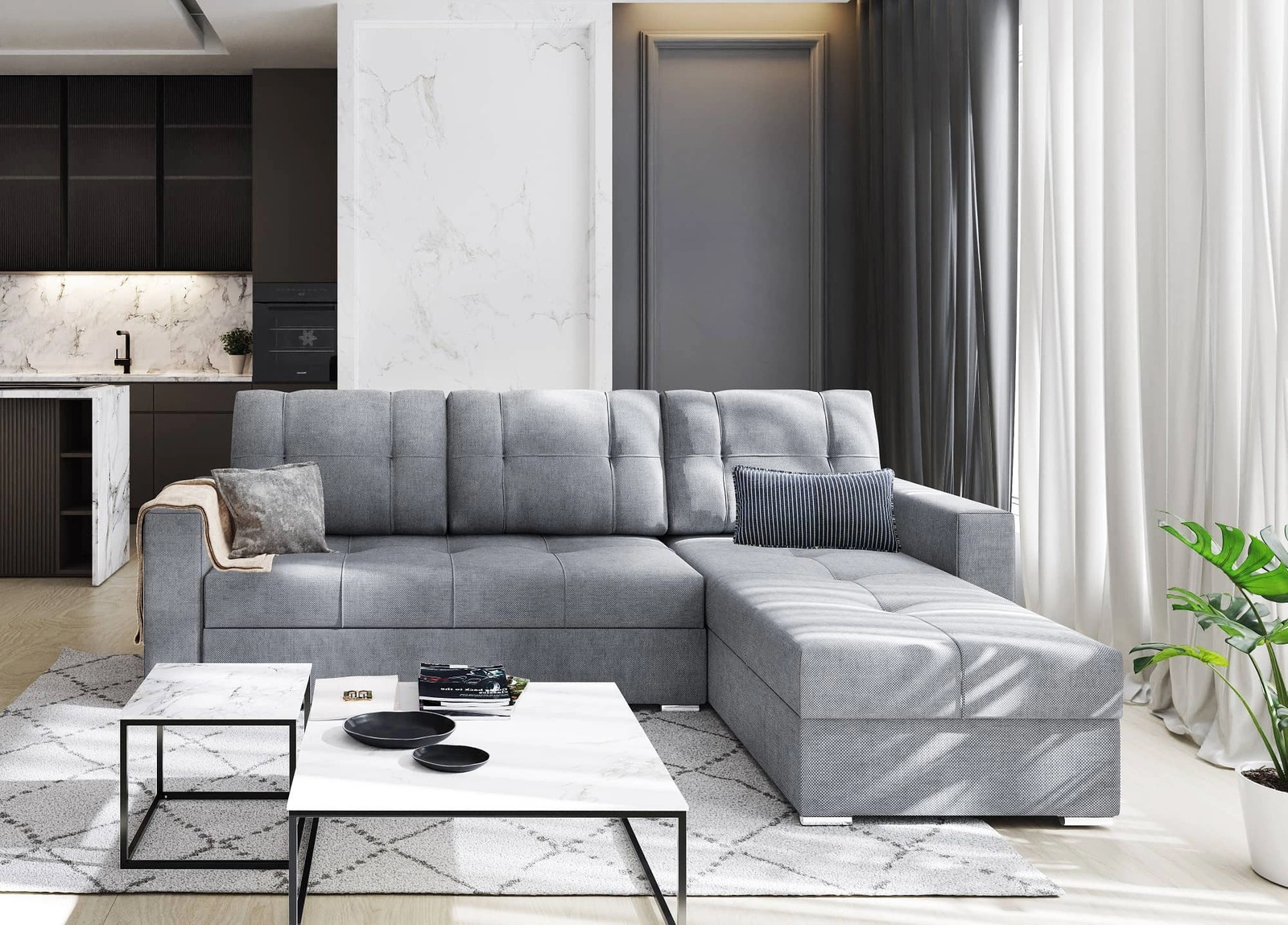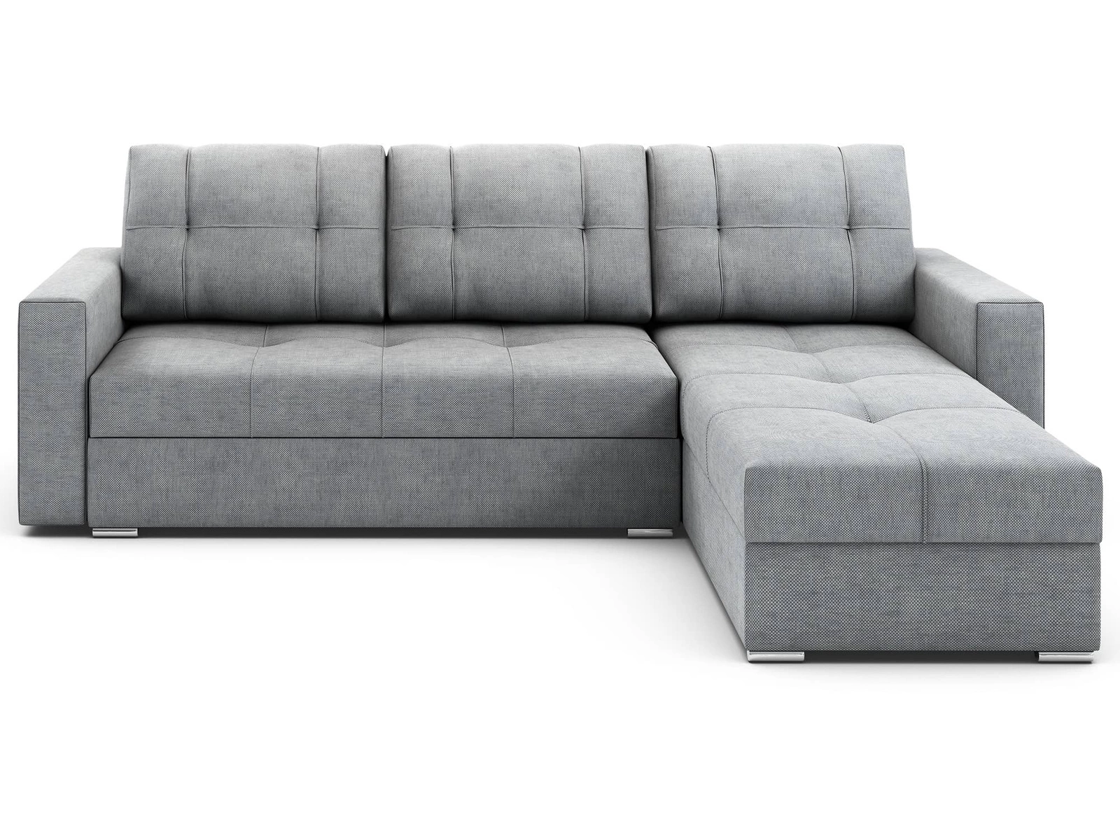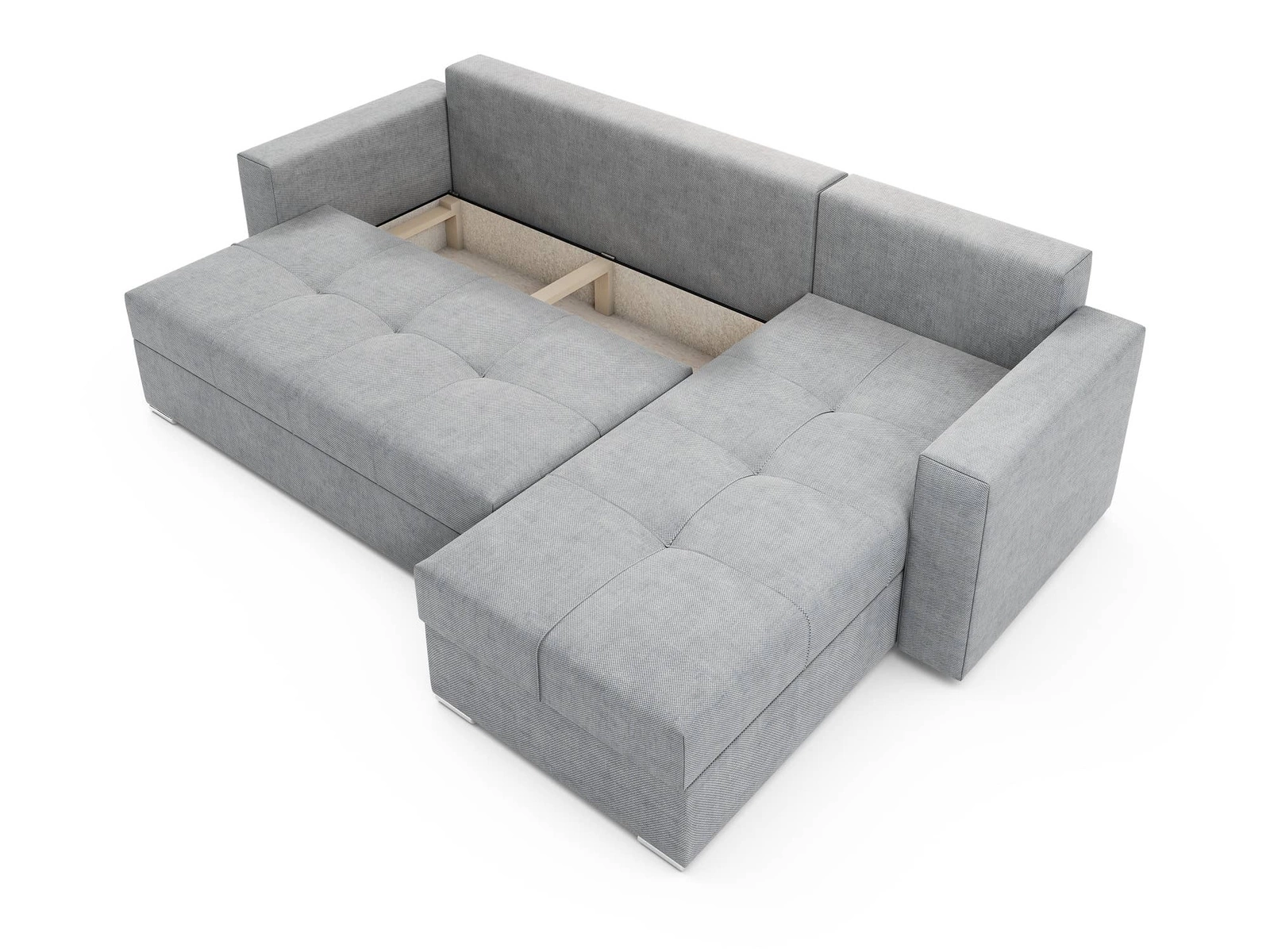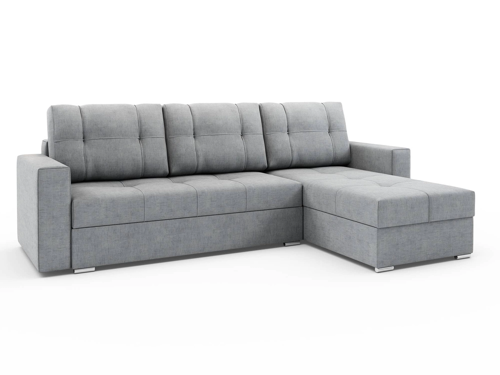 Das Aufklappen der kompletten Liegefläche ist sehr einfach und erfordert wenig Kraftaufwand. Der Sitz ist auf Holzkufen ausziehbar. Die Montageseite der Eckeinheit kann links oder rechts sein, was bedeutet, dass die Chaiselongue des Möbels bequem an den Bedarf für die Platzierung im Innenraum angepasst werden kann! Die Möbel sind ausgestattet mit verchromte Beine. Diese modernistische Ecke passt in jede Art von Raum! Garantiert eine komfortable und störungsfreie Nutzung und eine lange Lebensdauer des gesamten Möbelstücks. Perfekt für jedes Interieur in Ihrem Lieblingsstil!