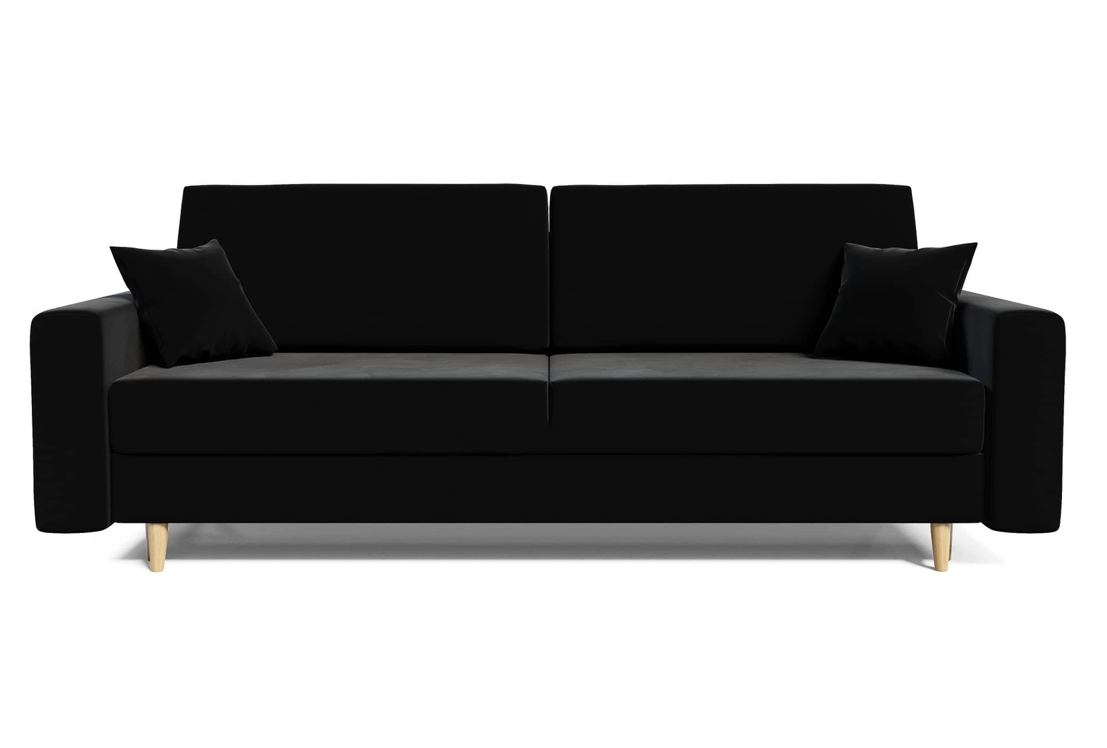 Sofa z funkcją spania Ines w kolorze czarnym to elegancki i funkcjonalny mebel, który doskonale sprawdzi się w każdym salonie. Wykonana z wysokiej jakości materiałów, zapewnia wygodę i trwałość użytkowania. Sofa jest wyposażona w funkcję spania, co czyni ją idealnym rozwiązaniem zarówno do codziennego odpoczynku, jak i do okazjonalnego nocowania gości. Jej minimalistyczny design, prostokątne kształty i głęboka czerń nadają wnętrzu nowoczesny i stylowy wygląd. Nóżki z jasnego drewna dodają kontrastu i lekkości całej konstrukcji, tworząc harmonijną kompozycję.