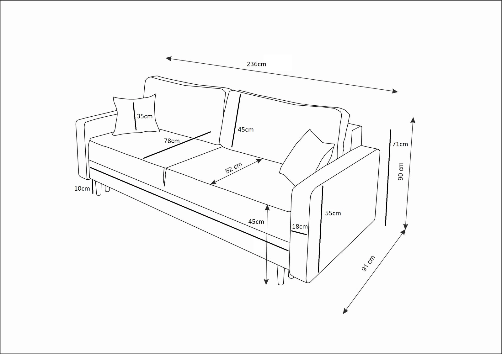 Das Sofa zeichnet sich durch eine Kombination aus traditionellem und skandinavischem Stil aus. Kombination aus farbigem Stoff und Holzbeinen verleiht dem Ganzen Finesse und Charakter. Hohe Rückenlehne sofas und große Kissen bieten eine angemessene Unterstützung für die Wirbelsäule und hohen Komfort. Zarte Nähte auf der Sitzfläche sind ein Blickfang. Sehr bequemer Sitz das Sofa ist aus gewellten Federn und hochwertigem Schaumstoff gefertigt. Darüber hinaus bieten die breiten Seiten eine bequeme Stütze für die Hände. Ines Sofa kann als bequemer Schlafplatz dienen. Das Ganze ist bezogen mit itaka pflegeleichtem Stoff, die sich sehr weich ist und sich angenehm anfühlt. Der verwendete Stoff hat schmutzabweisende Eigenschaften, die es sehr einfach macht, die Möbel sauber zu halten.