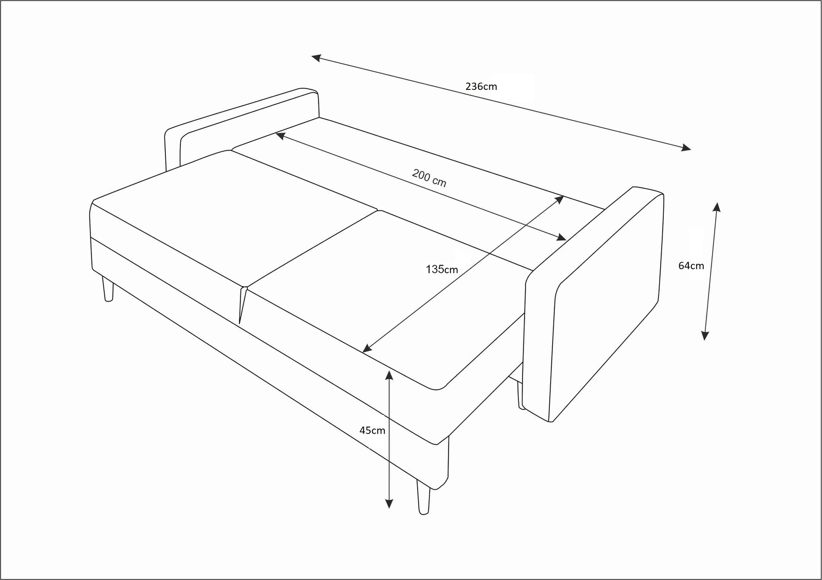 Das Aufklappen des Sofas ist sehr einfach und erfordert keinen großen Kraftaufwand. Das alles dank des DL-Mechanismus, der sich durch seine einfache Konstruktion und lange Lebensdauer auszeichnet. Die Liegefläche des Sofas beträgt 135x200 cm, mit bequemen und praktischen Sitzmöglichkeiten für zwei Erwachsene.