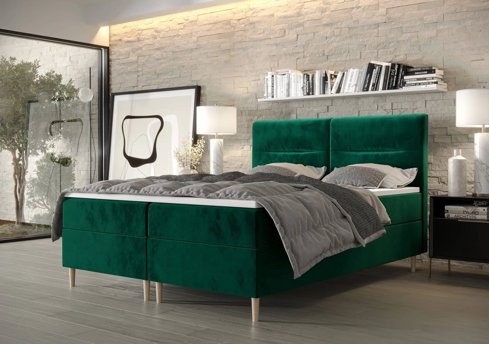 Boxspringbett Voltera 140x200 Flaschengrün moderner skandinavischer Stil mit charakteristischem Kopfteil