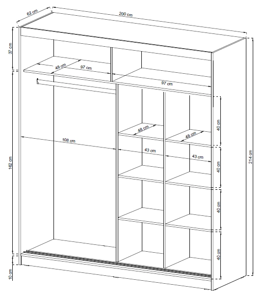 Breite 200 cm, höhe 214 cm und Tiefe 62 cm der verschiebbare Kleiderschrank passt in jede Art von Raum! Der verschiebbare Kleiderschrank garantiert bequem i problemlos nutzung und haltbarkeit des gesamten Möbelstücks für viele Jahre der Nutzung. Ideal für Schlafzimmer, Wohnzimmer, Ankleidezimmer und Flur.