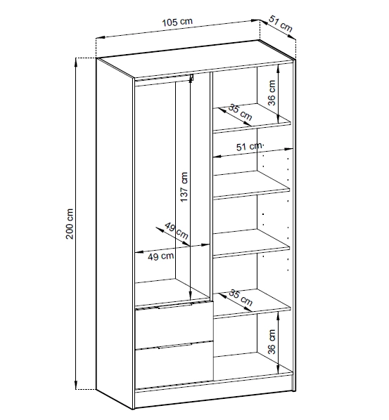 Breite 105 cm, höhe 200 cm und Tiefe 51 cm die Garderobe passt in jede Art von Raum! Der Schrank garantiert komfortable und problemlose Nutzung und Langlebigkeit des gesamten Möbelstücks für viele Jahre der Nutzung. Die Möbel sind ideal für das Schlafzimmer, die Diele und das Wohnzimmer.