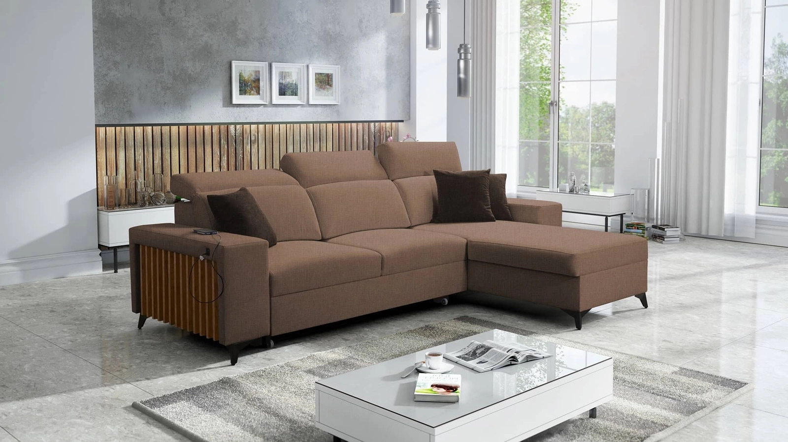 Ecksofa Kelly in Hellbraun mit verstellbaren Kopfstützen ist ein Rezept für ein modernes Interieur in Ihrem Zuhause!