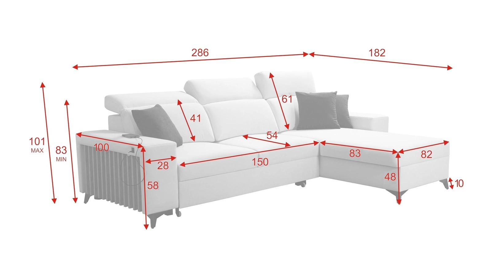 Breite der Ecke 286 cm, maximale Höhe 101 cm und Tiefe 182 cm. Die Liegefläche der Eckeinheit ist 122x230 cm. Die Sitzhöhe des Möbels beträgt 48 cm und die maximale Höhe der Rückenlehne beträgt 61 cm. Gewellte Federn und T30-Polyurethanschaum ist das Material, aus dem der Sitz der Ecke gefertigt ist. Feste Rückenlehne mit verstellbaren Kopfstützen garantiert komfortable Entspannung nach einem langen Tag, die Sie, Ihre Lieben und auch Gäste, die auf diesem einzigartigen Ecksofa Platz nehmen, zu schätzen wissen werden!