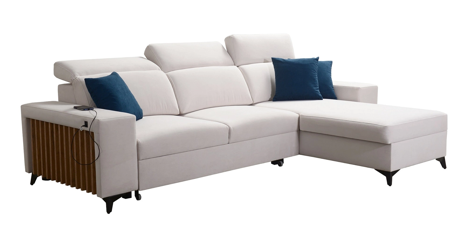 Weitere Merkmale dieses Möbelstücks, die von allen Nutzern geschätzt werden, sind ein Bettzeugbehälter, eine Schlaffunktion, eine USB-Buchse an der Seite der Ecke zum Aufladen des Telefons und anderer Multimedia-Geräte.