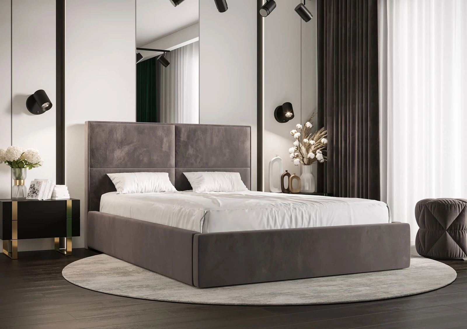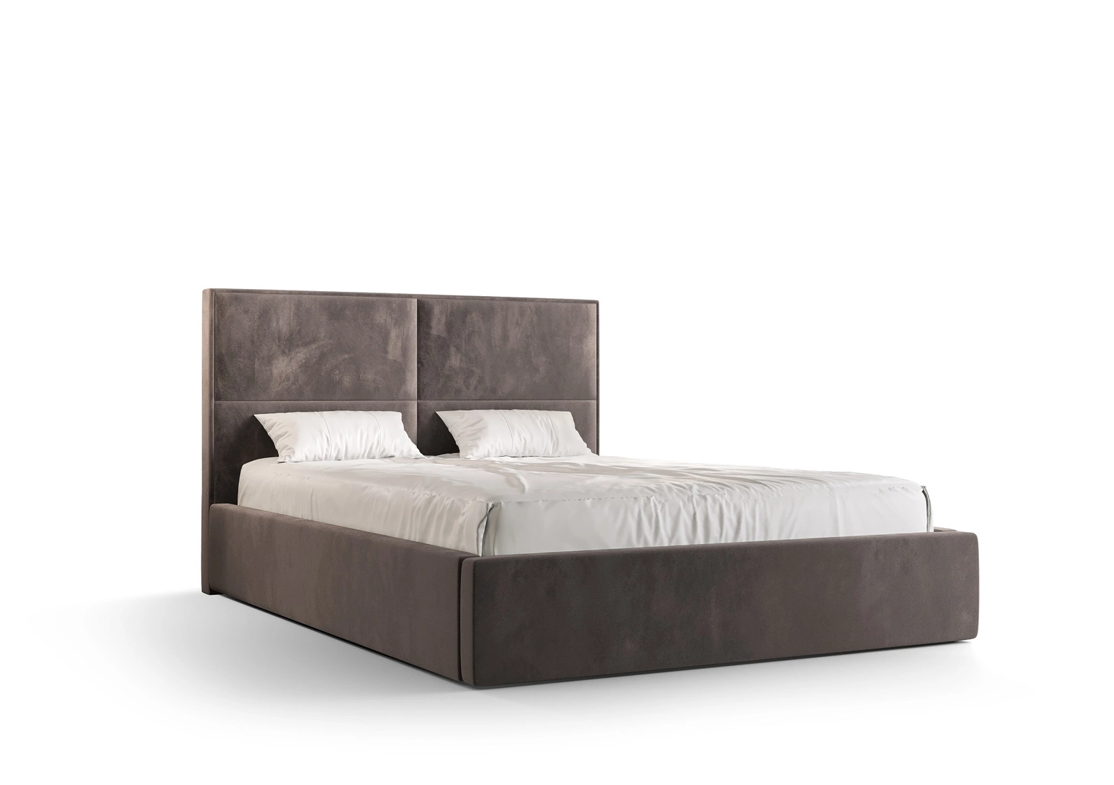 Bett aus Stoff typ velvet Monolith 15 garantiert ein Höchstmaß an Komfort und Funktionalität für die tägliche Entspannung im Schlafzimmer. Der Stoff hat eine Beschichtung aus hydrophob, was eine begrenzte Flüssigkeitsaufnahme gewährleistet. Die interessante Struktur des Gewebes verleiht einen einzigartigen Charakter. Dank der Eigenschaften des verwendeten Stoffes behält das Bett lange Zeit sein ursprüngliches Aussehen. Das Design des Bettes sorgt für große Stabilität und Komfort bei der Benutzung. Der Bettrahmen ist aus Holz und Möbelplatte gefertigt. Bequeme und praktische Kopfstütze ist mit vier rechteckigen Platten versehen.