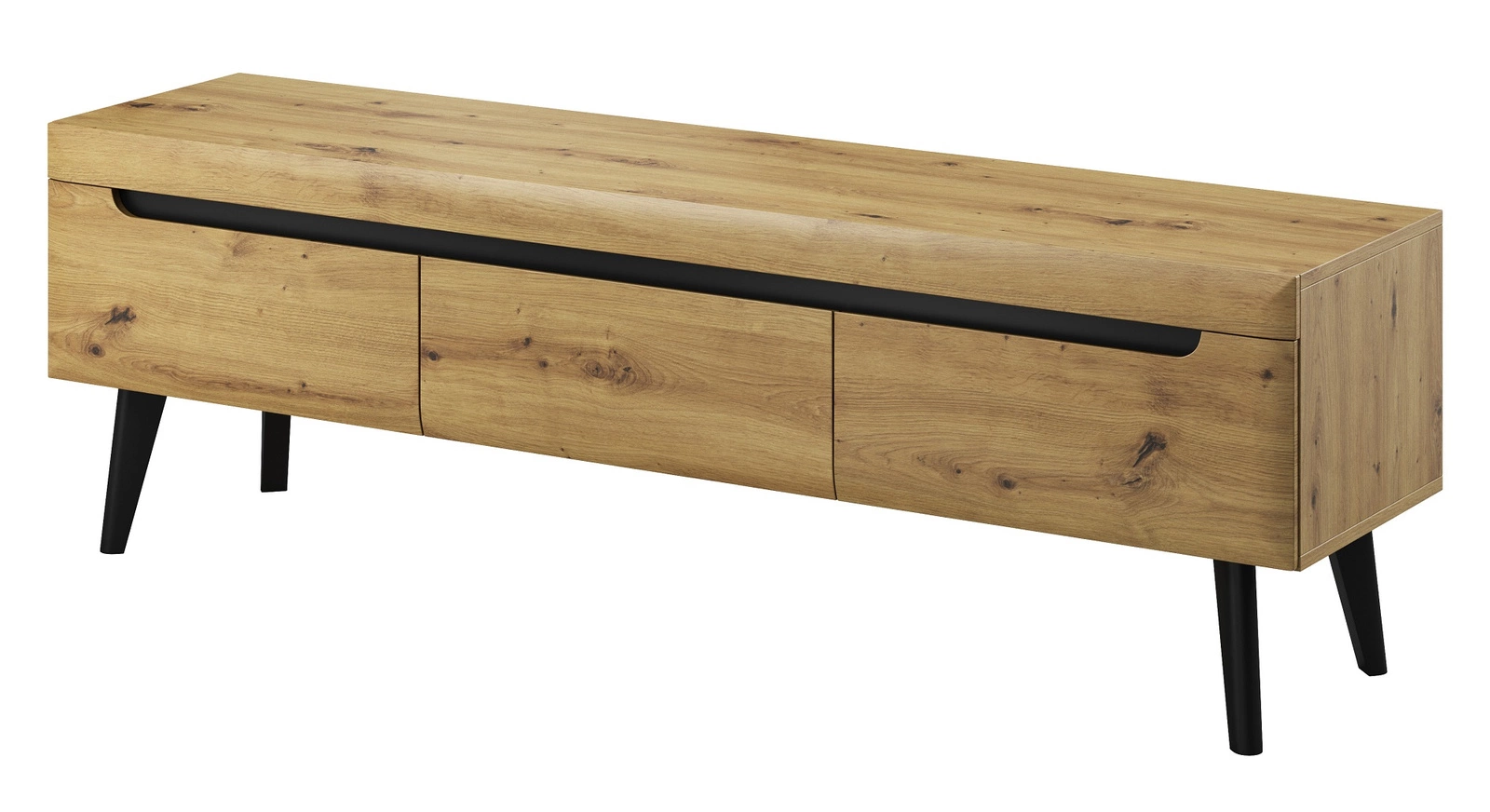 Fronten in handwerkliche Eiche in mattem Finish werden durch Einsätze in schwarz. Die Struktur der Möbel ist verstärkt holzbeine skandinavischer Stil.