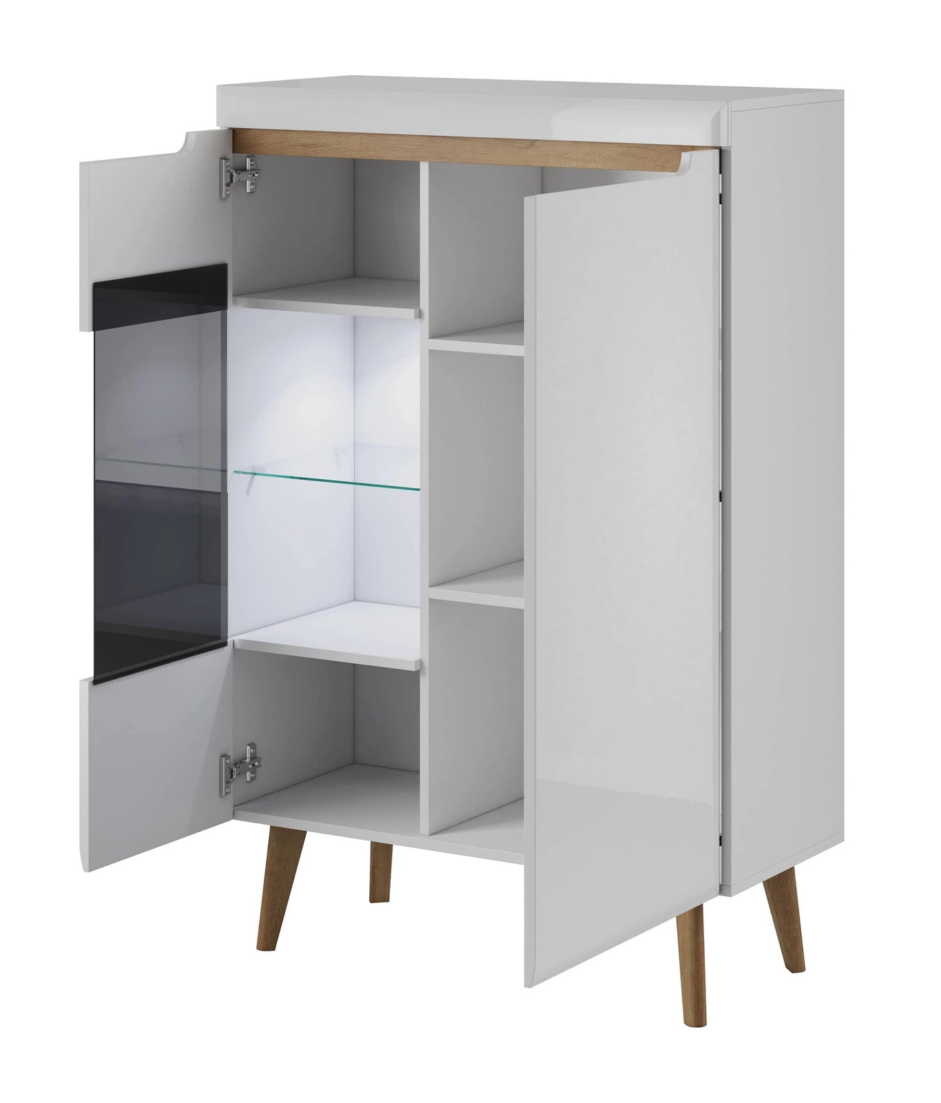 • Modernes Design. Fronten des Oberschrankes aus 16 mm starker MDF-Platte. Korpusse aus 16 mm starker laminierter Platte. Kante mit ABS-Furnier ummantelt. Elemente aus gehärtetem Sicherheitsglas. Hölzerne Beine.