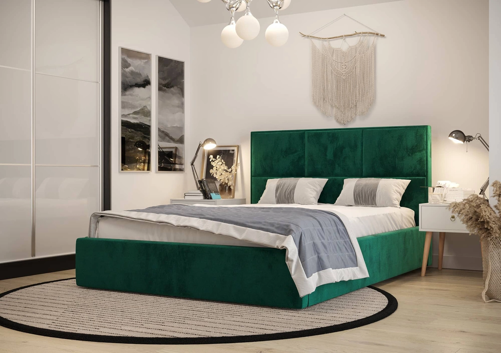 Das Polsterbett Hestia 140x200 in Flaschengrün ist eine perfekte Lösung für modern, skandinavisch und klassisch eingerichtete Schlafzimmer.