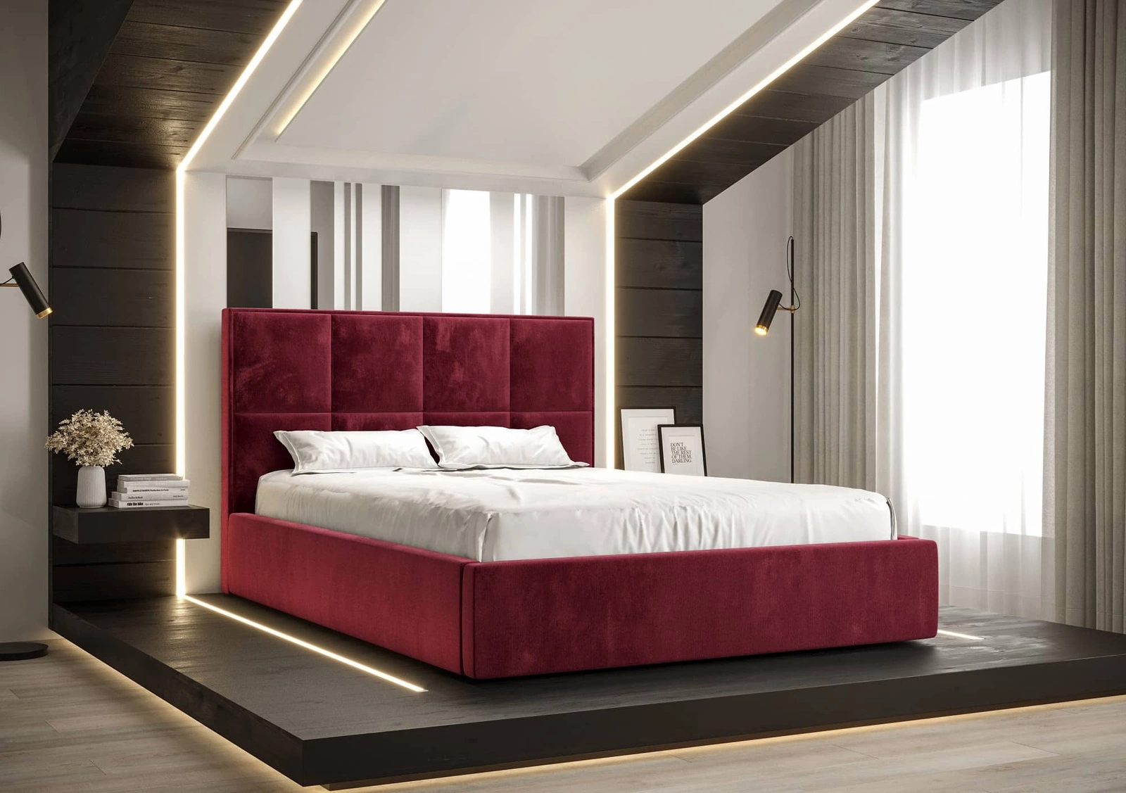 Das Polsterbett Aresa 180x200 in Dunkelrot ist eine ideale Lösung für modern, skandinavisch und klassisch eingerichtete Schlafzimmer.