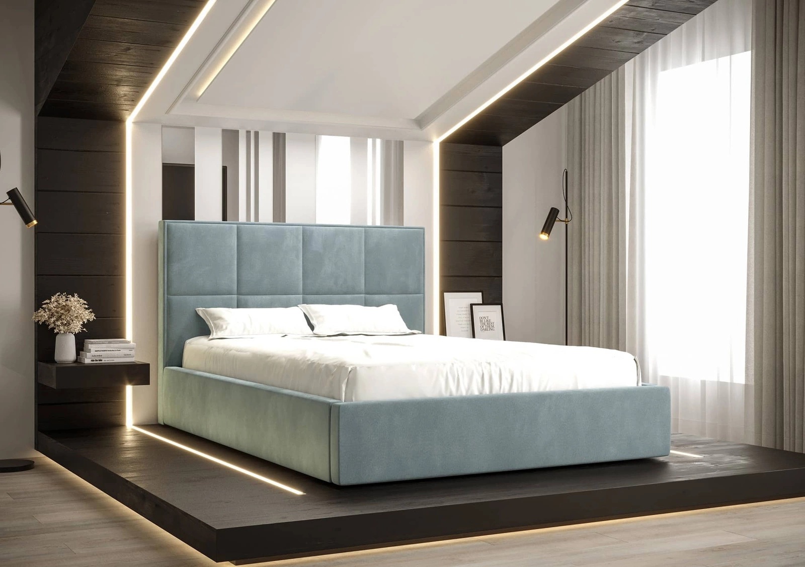 Bett aus Stoff typ velvet Monolith 72 garantiert ein Höchstmaß an Komfort und Funktionalität für die tägliche Entspannung im Schlafzimmer. Der Stoff hat eine Beschichtung aus hydrophob, was eine begrenzte Flüssigkeitsaufnahme gewährleistet. Die interessante Struktur des Gewebes verleiht einen einzigartigen Charakter. Dank der Eigenschaften des verwendeten Stoffes behält das Bett lange Zeit sein ursprüngliches Aussehen. Das Design des Bettes bietet große Stabilität und Komfort bei der Benutzung. Der Bettrahmen ist aus Holz und Möbelplatte gefertigt. Bequeme und praktische Kopfstütze ist mit acht rechteckigen Platten versehen.
