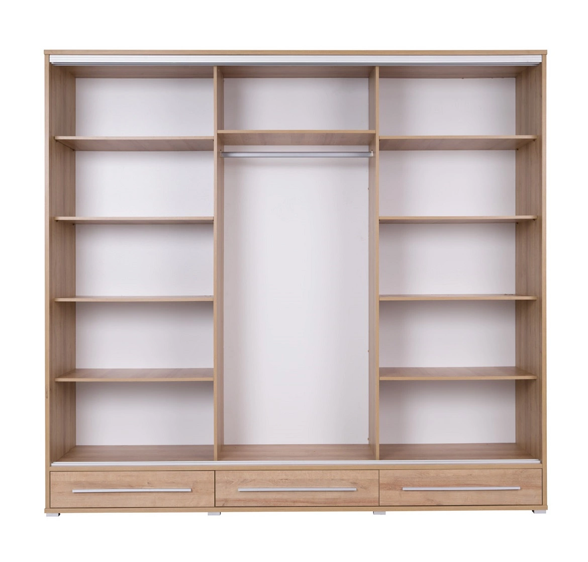 Breite 255 cm, höhe 236 cm und Tiefe 61 cm der verschiebbare Kleiderschrank passt in jede Art von Raum! Der verschiebbare Kleiderschrank garantiert bequem i problemlos nutzung und haltbarkeit des gesamten Möbelstücks für viele Jahre der Nutzung. Ideal für Schlafzimmer, Wohnzimmer, Ankleidezimmer und Flur.
