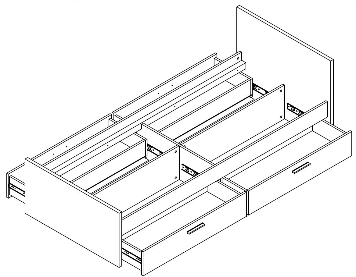 Die Standardausstattung des Bettes umfasst 4 Schubladen auszug auf kugelgelagerten Schienen.