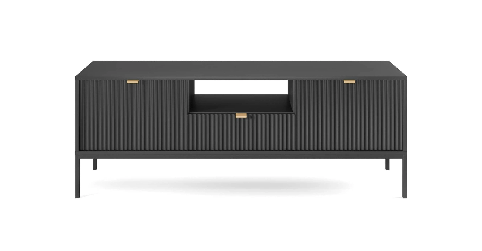 Der RTV-Schrank besteht aus 2 Türen und 1 Schublade. Die Aussparung in der Mitte des Schranks ist ein idealer Platz für Fernsehgeräte oder eine Spielkonsole. Der RTV-Schrank garantiert komfortable und störungsfreie Nutzung und Langlebigkeit des gesamten Möbelstücks für viele Jahre der Nutzung. Stilvolles Schwarz lässt sich gut mit anderen Farben kombinieren, so dass Lovro-Möbel perfekt zu jeder Einrichtung passen.