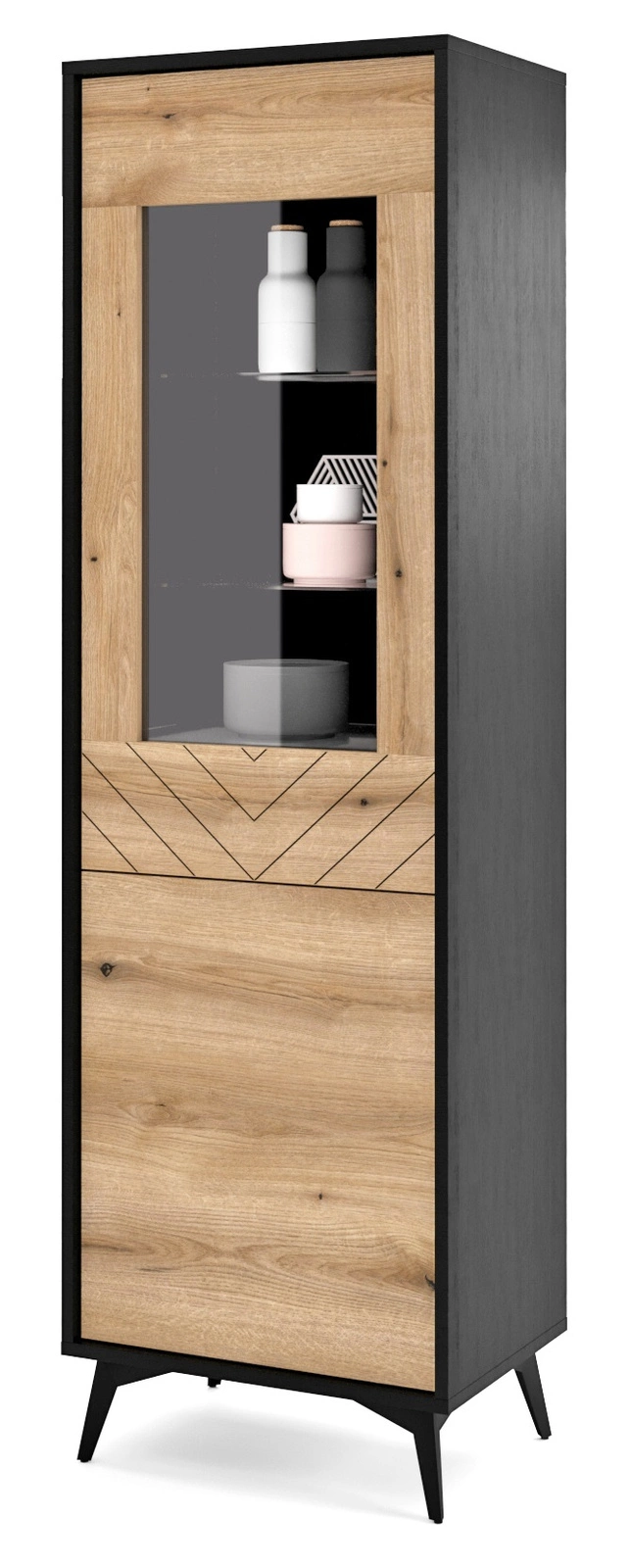 Unverwechselbares Schwarz der Korpus ist perfekt auf die Fronten in der Farbe eiche evoke. Subtile und ungewöhnliche Fräsungen an der Tür in einem fischgrätenmuster verleiht Leichtigkeit und Stil. Verglaste Front zur Präsentation von Wohnaccessoires. Die Struktur der Möbel wurde mit Metallbeinen verstärkt metallbeinen 14 cm hoch.