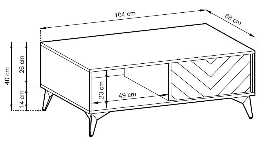 Unverwechselbares Schwarz korpus und Tischplatte lassen sich perfekt mit Fronten in der Farbe eiche evoke. Dezentes und ungewöhnliches Fischgrätenmuster auf der Schubladenfront fischgrätenmuster verleiht Leichtigkeit und Stil. Die Struktur der Möbel wurde mit Metallbeinen verstärkt metallbeinen 14 cm hoch. Die Gusto-Couchtischplatte ist auslaufsicher.
