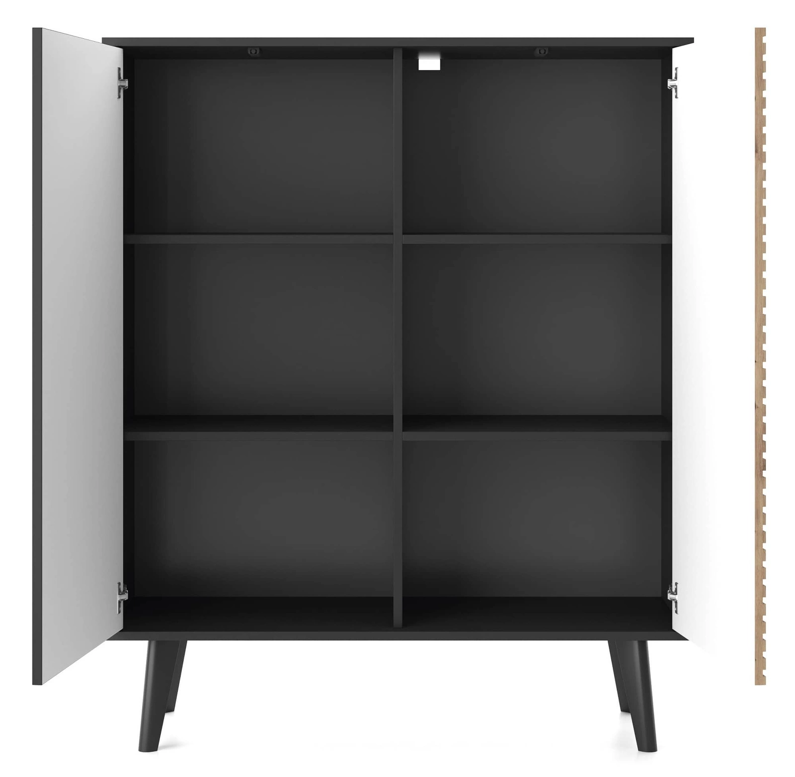 Die Kommode Saipan ist die ideale Wahl für Liebhaber moderner Einrichtungen mit elegantem Charakter, für die auch die breite Funktionalität wichtig ist funktionalität möbel. Eine interessante Kombination aus geriffelten Fronten in Eiche mit kontrastierendem Schwarz verleihen der Kommode ein originelles und ästhetisch ansprechendes Aussehen.