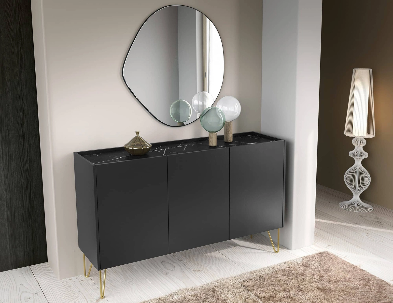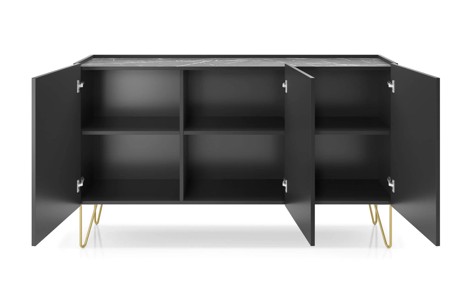Die Kommode Madisonum 144 cm Schwarzer Graphit / Schwarzer Königs-Marmor ist ein stilvolles Möbelstück, das sich perfekt in jedes Wohnzimmer oder Sitzungszimmer einfügt.