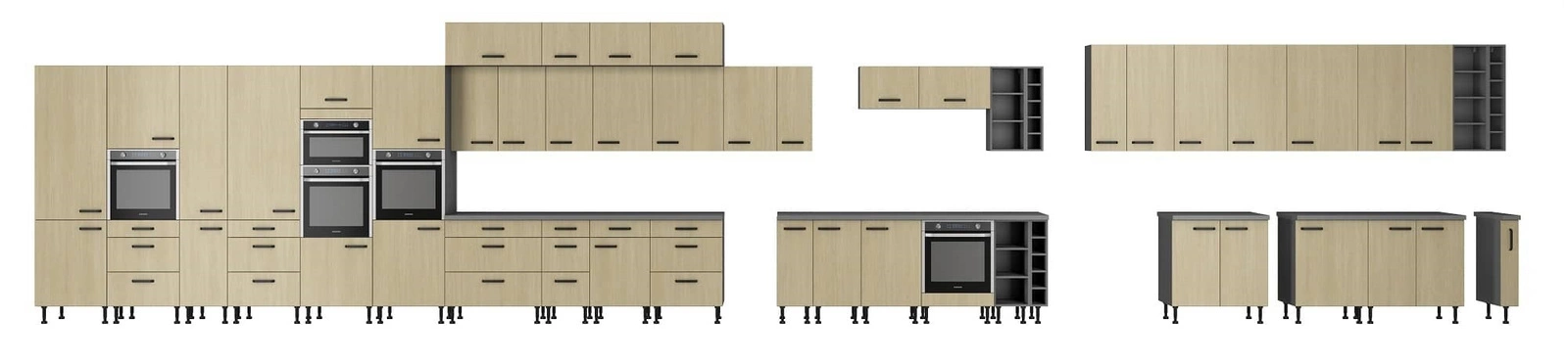 Der anthrazitfarbene Küchenschrankkorpus ist aus hochwertiger laminierter Platte 16 mm dick. Der Vorteil dieser Art von Platten ist hohe Widerstandsfähigkeit gegen äußere Einflüsse wie Dampf, Hitze, verschüttete Flüssigkeiten. ABS-Furnierkanten erhöhen die Haltbarkeit des Küchenschranks.