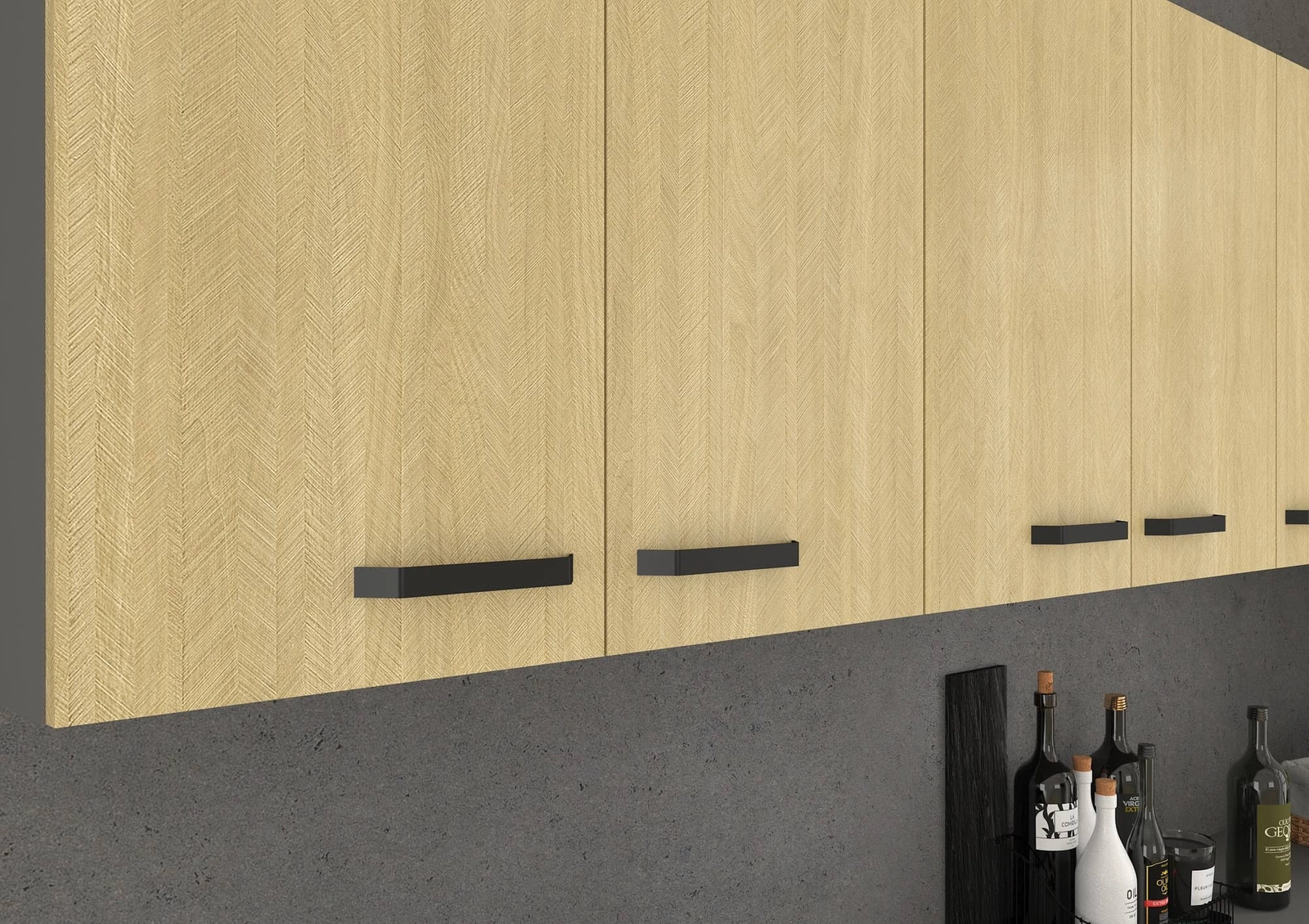 Die beigen Küchenschranktüren sind aus laminierter Platte und fertig stilvolles Fischgrätendekor. Die Vorderseite ist sehr widerstandsfähig gegen Feuchtigkeit und Unfallschäden. Ein stilvoller Abschluss der Küchenschranktür ist der schwarzer Metallgriff.