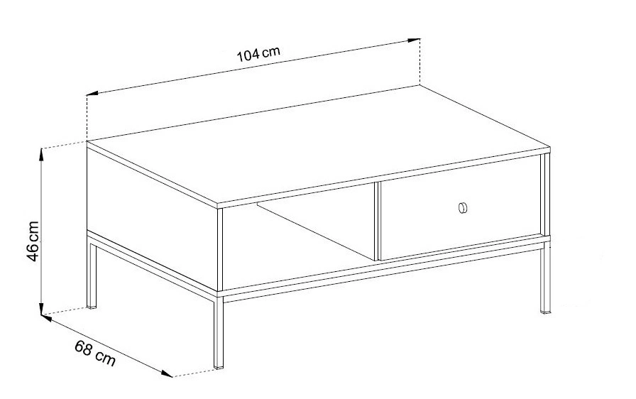Der Couchtisch ist hergestellt aus laminierter Platte von hoher Qualität 16 mm dick, widerstandsfähig gegen äußere Einflüsse wie Prellungen, Stöße und unglückliche Kratzer. Ein stilvoller Abschluss der Tischfronten sind die kleinen goldfarbenen Griffe. Die Struktur der Möbel wurde variiert mit schwarzen Metallbeinen.