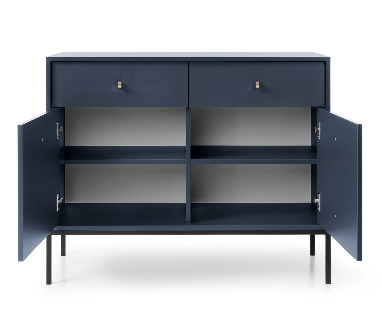 Die Kommode ist gefertigt aus 2 Türen und 2 Schubladen. Die Kommode garantiert komfortable und problemlose Nutzung und Langlebigkeit des gesamten Möbelstücks für viele Jahre der Nutzung. Kräftiges und tiefes Marineblau mischt sich gut mit anderen Farben und macht die Kommode Mono zu einem großartigen wird geprüft kann als Kommode für das Wohnzimmer oder als Kommode für das Schlafzimmer verwendet werden.