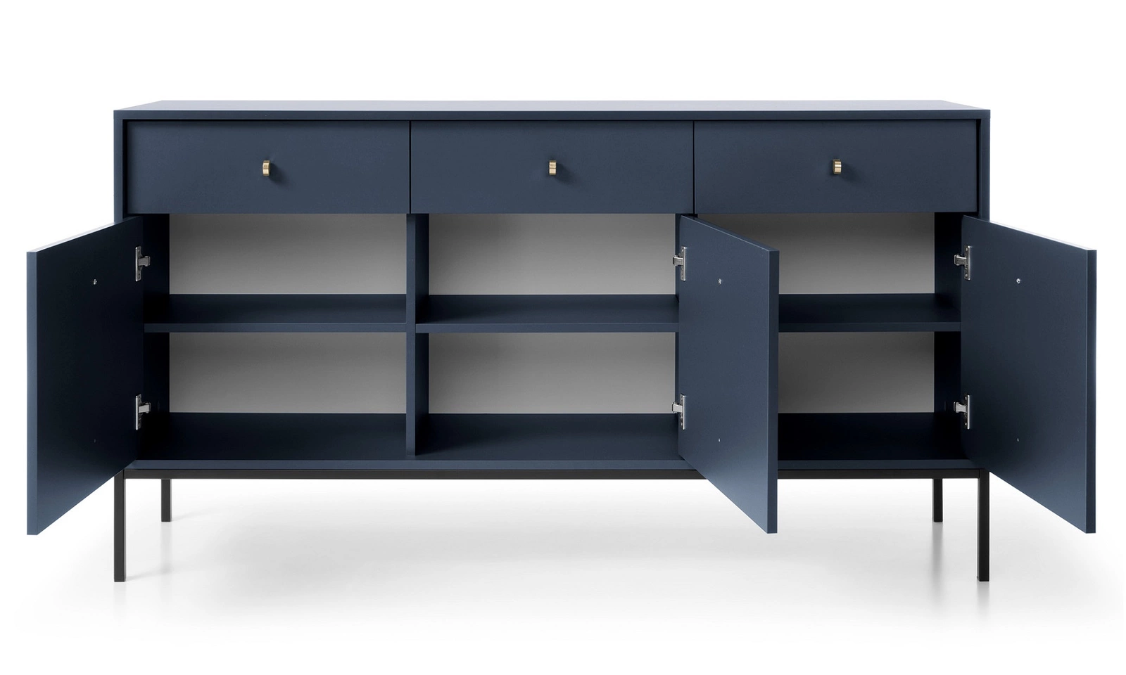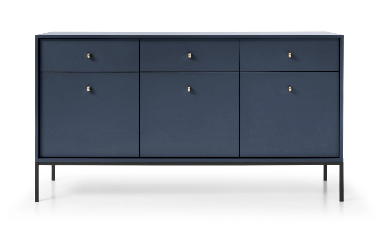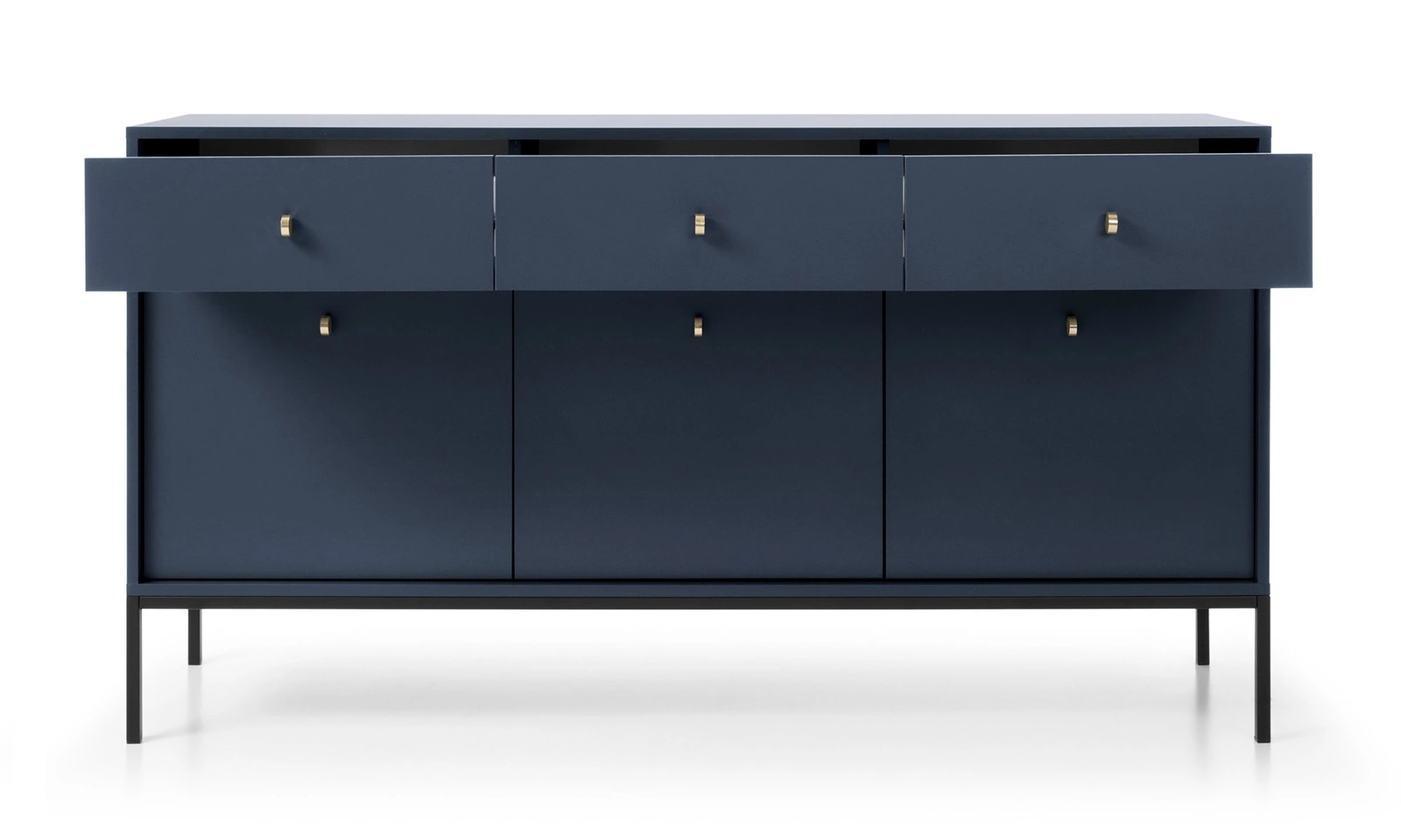 Die Kommode mit Schubladen Mono 154 cm in Dunkelblau ist ein stilvolles Möbelstück, das perfekt in jedes Wohn- oder Esszimmer passt.