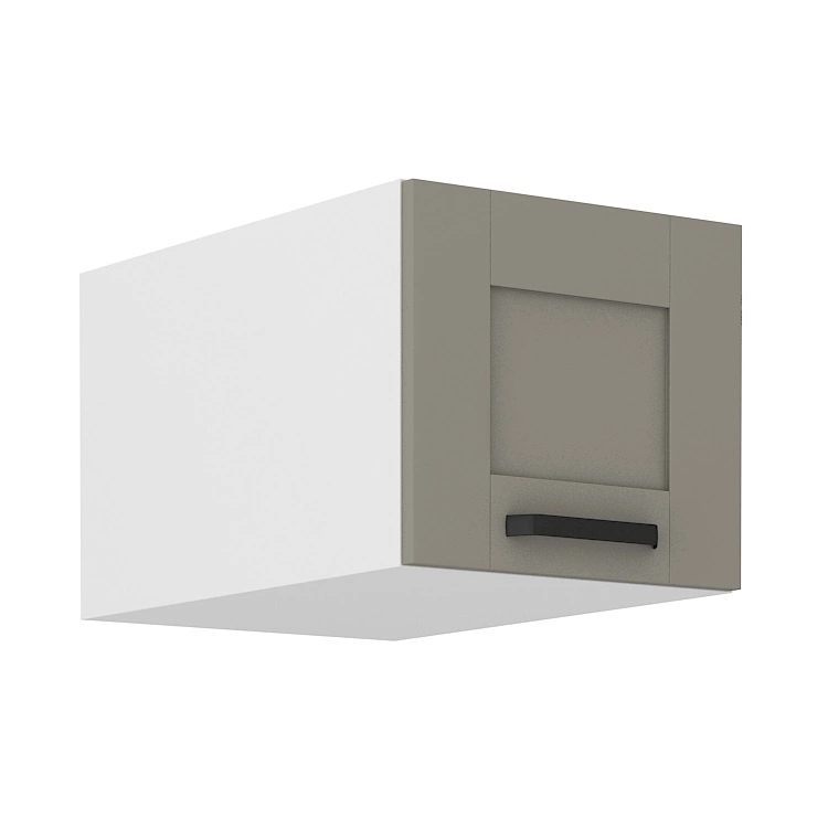 Küchen-Hängeschrankfront in graubeige ist aus MDF-Platte hergestellt und mit einem Rahmen im -Stil abgeschlossen. Die Kante der Küchenschrankfront ist durch ABS-Furnier geschützt, das zwei Funktionen hat. Es ist eine Sicherheit gegen Feuchtigkeit und schützt die gegen zufällige Beschädigung.