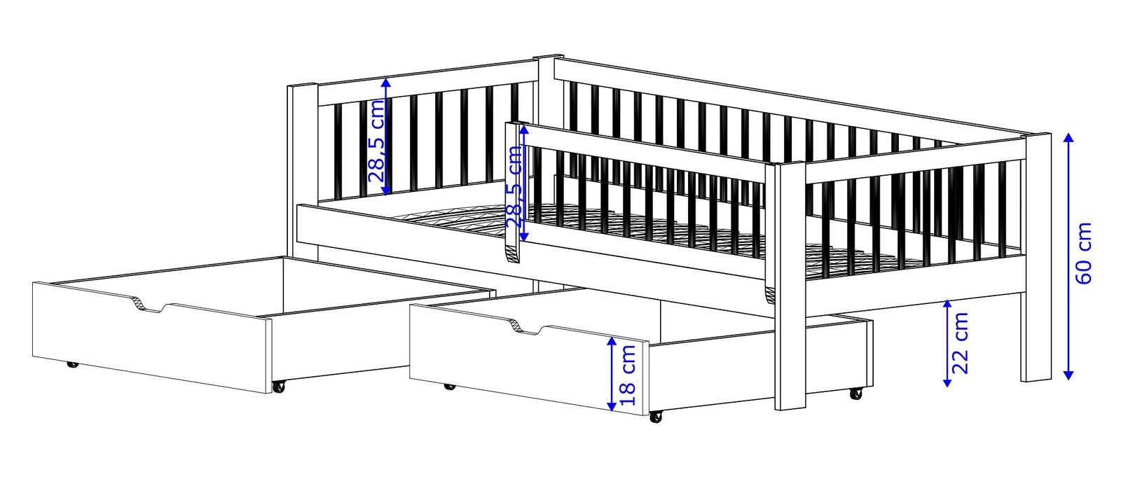 Für mehr Funktionalität ist das Kinderbett ausgestattet mit geräumigen schubladen, für die bequeme Aufbewahrung von wichtigem Zubehör.