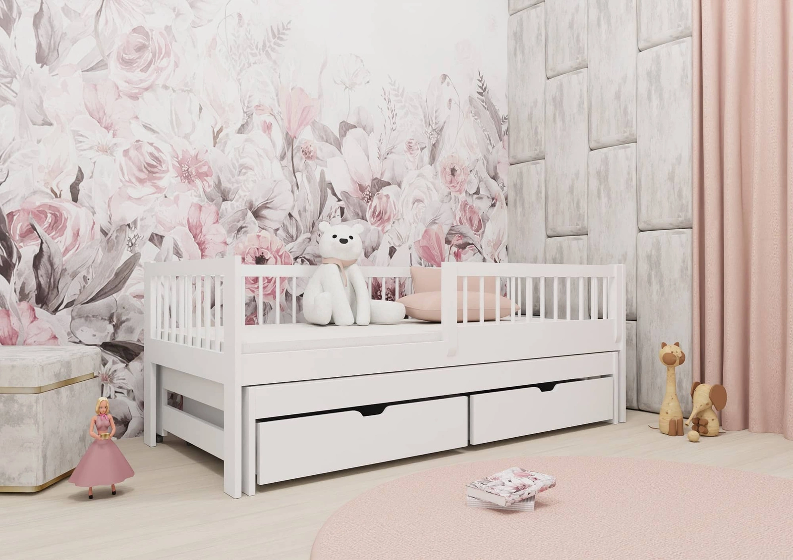 Holzbett Simba ist die perfekte Wahl für ein Kinderzimmer. Solivendesign das Bett bietet Komfort und Sicherheit beim Schlafen und Spielen. Das Bett Simba ist hergestellt aus massivem Kiefernholz gemalt weiß, die sich durch einen großen robust und widerstandsfähig gegenüber externen Faktoren. Ausziehbares Bett für Kinder ist mit zwei Rollen ausgestattet, die das Herausziehen erleichtern. Bewährtes Befestigungssystem mit Holzdübeln und Konfirmationsschrauben sorgt für hohe Stabilität der gesamten Konstruktion.