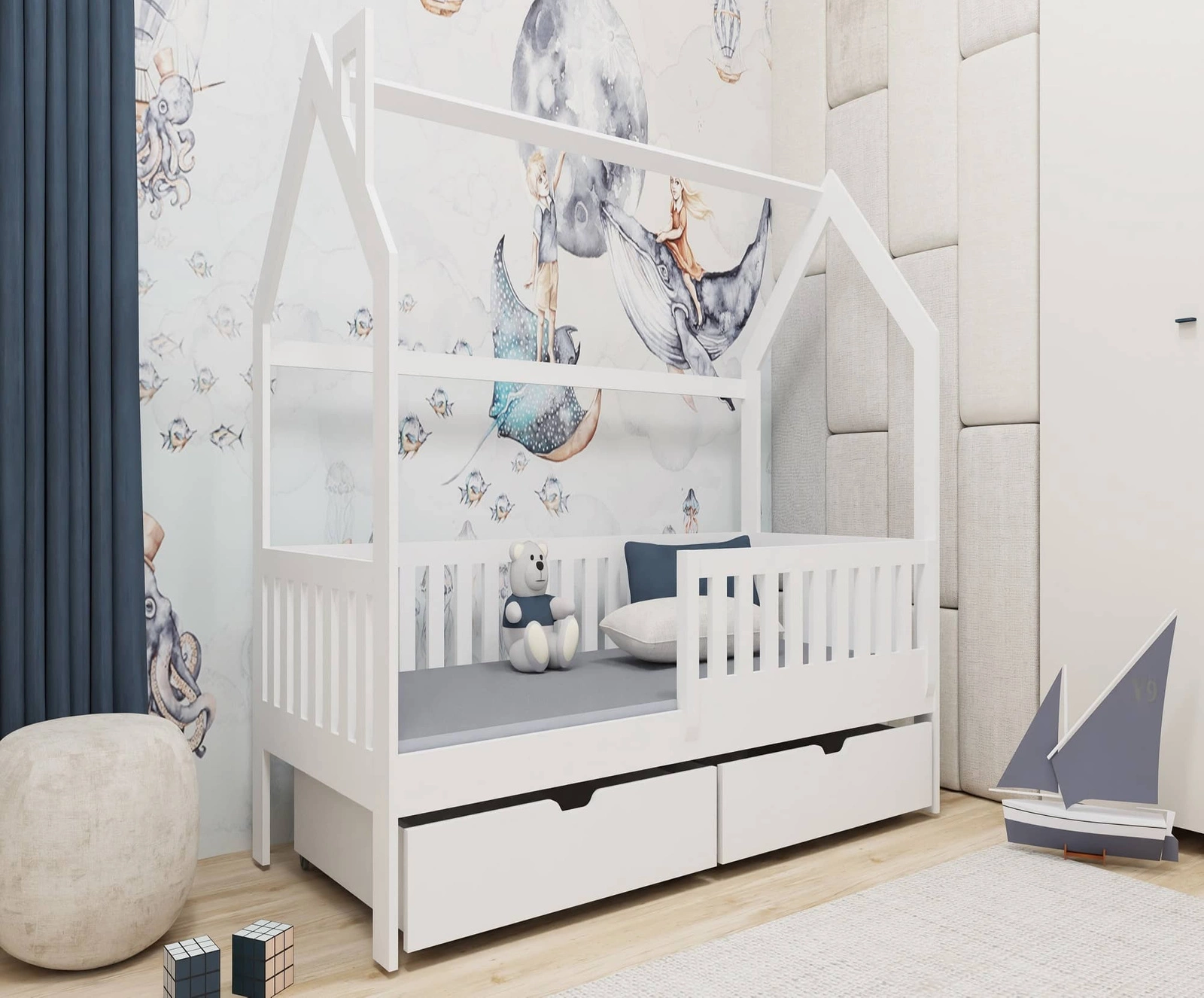 Timon Holzbett 70x140 cm weiß modernes Design Kinderhausbett aus massivem Kiefernholz geräumige Schubladen