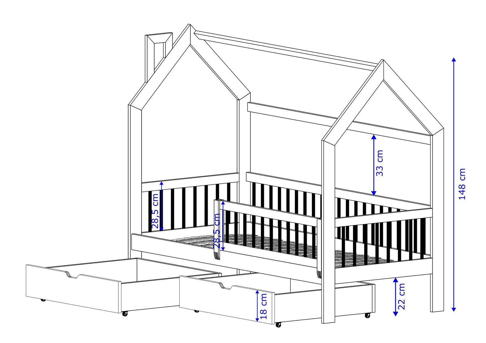Das Holzbett Pumba ist die ideale Wahl für Liebhaber moderner und klassischer Arrangements mit elegantem Charakter, für die eine breite Palette von funktionalität möbel. Aufgrund seiner geringen Größe ist er auch für kleinere Wohnungen geeignet. Dekorativer Bettrahmen in Form eines Häuschens verleiht dem Ganzen ein originelles Aussehen, das jedem Kind gefallen wird. Uviele Möglichkeiten zur Personalisierung und die Gestaltung des Bettes selbst und des gesamten Kinderzimmers.