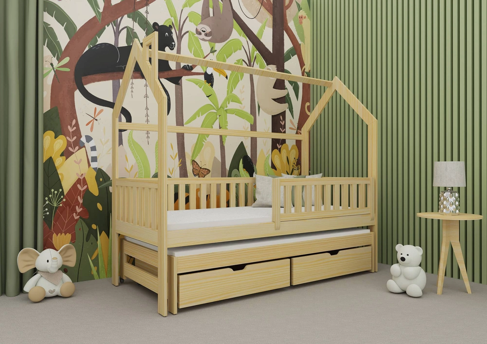 Das Holzbett Miki ist die ideale Wahl für Liebhaber moderner Einrichtungen mit elegantem Charakter, für die es auch wichtig ist, eine breite funktionalität möbel. Kinderbett aus Holz mit Auszug teil von ist die perfekte Wahl für kleinere Wohnungen und ein Zimmer, das von zwei Kindern geteilt wird. Doppelbetten aus der Kollektion Miki anbieten zwei bequeme Sitze zu schlafen ohne viel Platz zu beanspruchen. Dekorativer Bettrahmen in Form eines Häuschens verleiht dem Ganzen ein originelles Aussehen, das jedem Kind gefallen wird. Uviele Möglichkeiten zur Personalisierung und die Gestaltung des Bettes selbst und des gesamten Kinderzimmers.