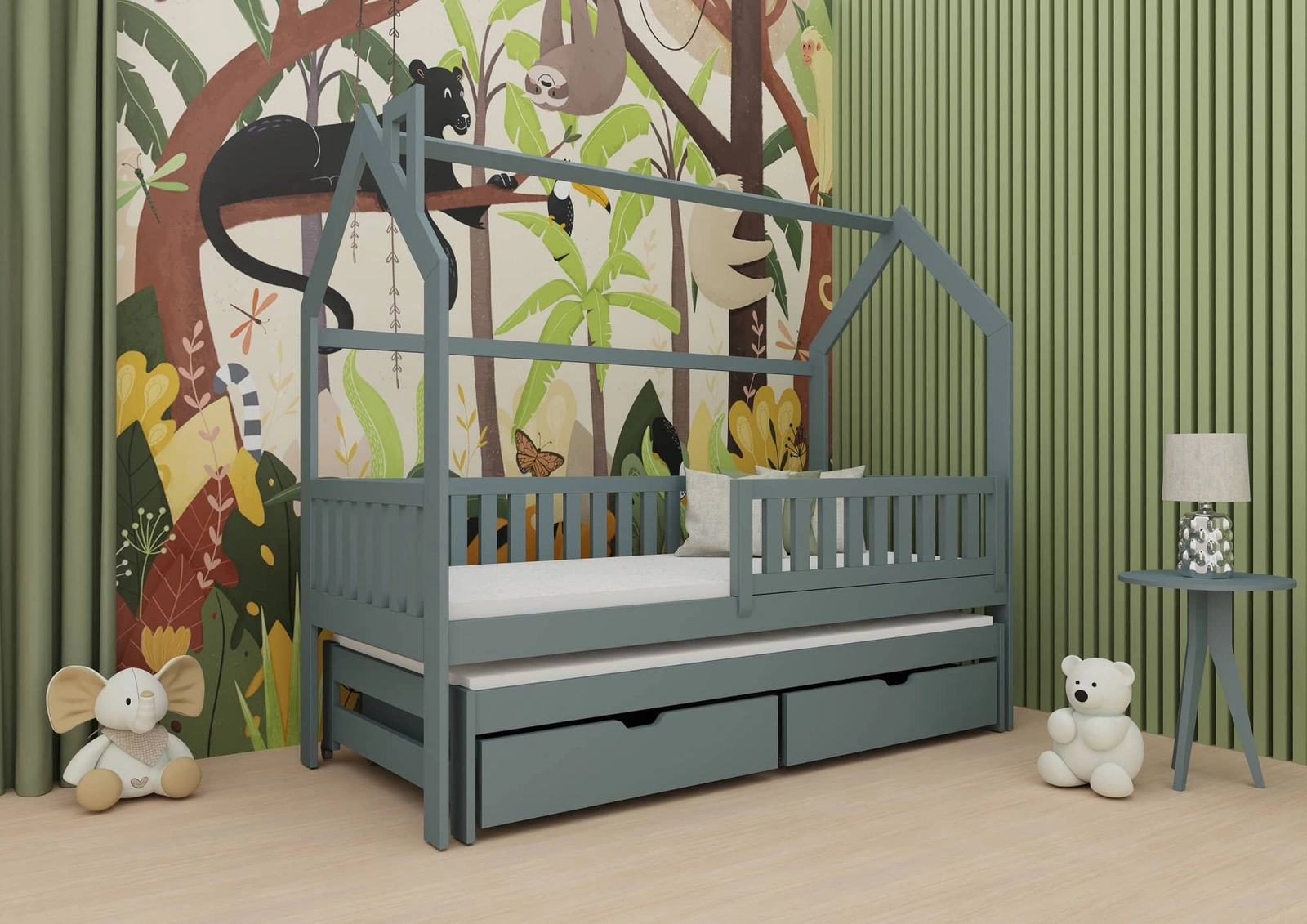 Haus Etagenbetten ist die perfekte Wahl für ein Kinderzimmer. Solivendesign das Bett bietet Komfort und Sicherheit beim Schlafen und Spielen. Das Kinderbett Miki ist hergestellt aus massivem Kiefernholz gemalt grau, die sich durch einen großen robust und widerstandsfähig gegenüber externen Faktoren. Ausziehbares Bett für Kinder ist mit zwei Rollen ausgestattet, die das Herausziehen erleichtern. Bewährtes Befestigungssystem mit Holzdübeln und Konfirmationsschrauben sorgt für hohe Stabilität der gesamten Konstruktion.