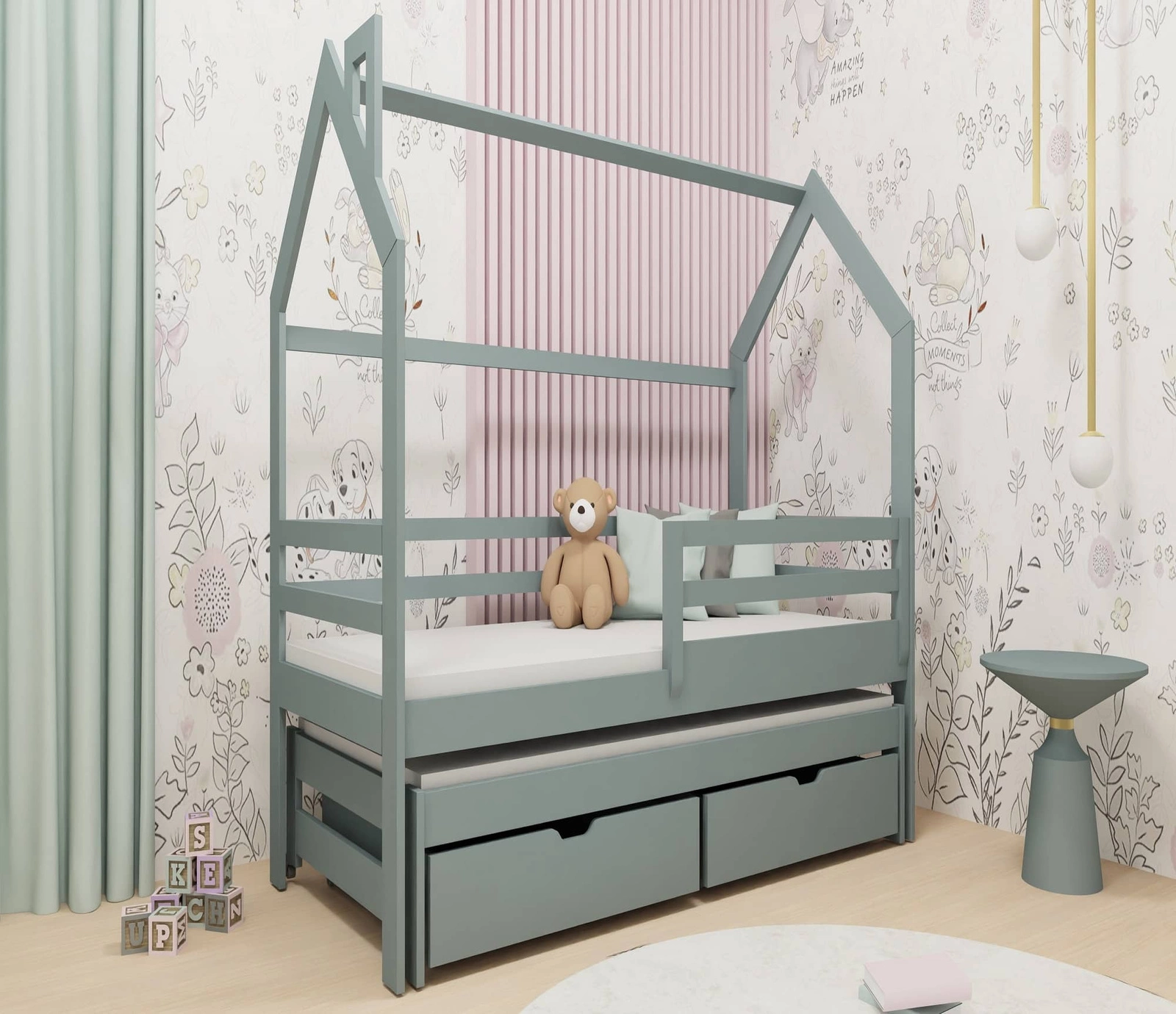 Kinderbett Chip 70x140 cm Grau Ausziehbares Doppelbett für das Kinderzimmer Holzbett in Form eines Hauses mit geräumigen Schubladen