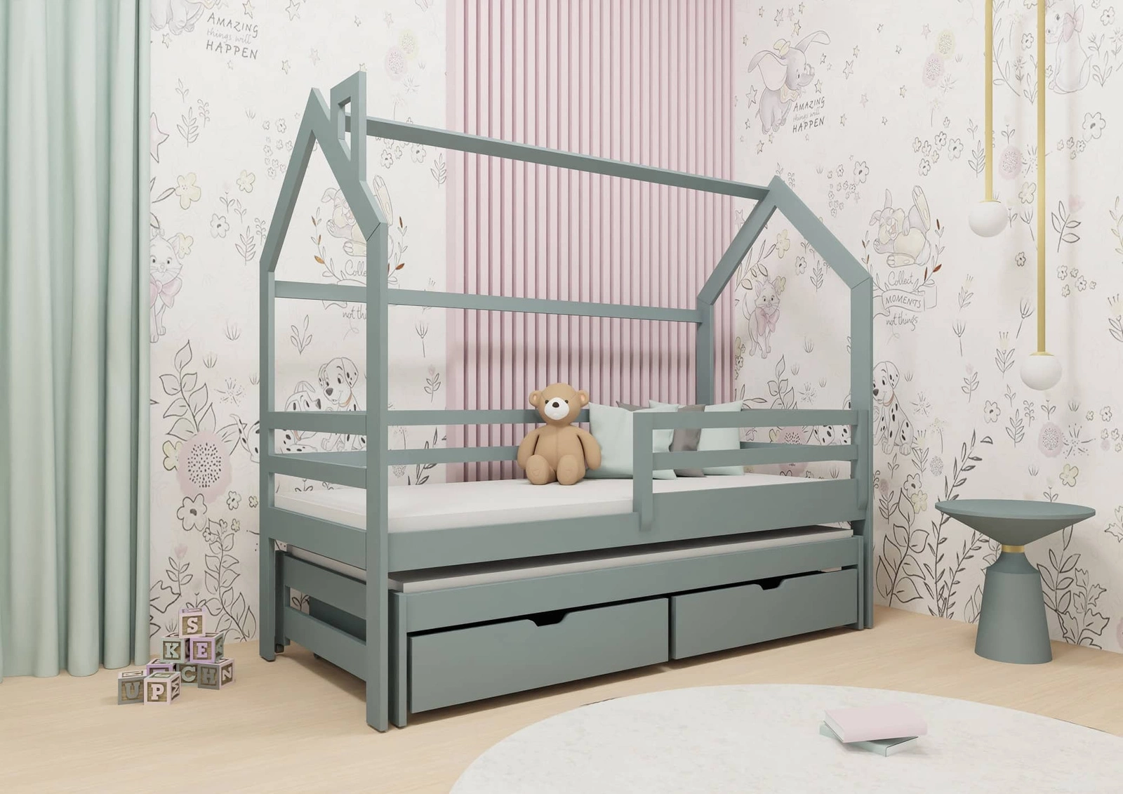 Kinderbett Chip 90x180 cm Grau Ausziehbares Doppelbett für das Kinderzimmer Holzbett in Form eines Hauses mit geräumigen Schubladen