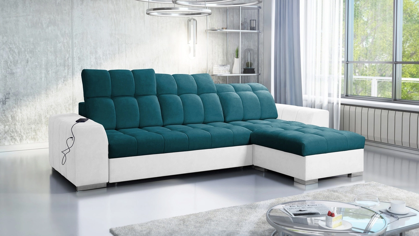 Ecksofa Luigi in Türkis/Weiß mit verstellbaren Kopfstützen ist ein reizvolles Möbelstück mit Garantie für höchsten Komfort und Funktionalität!