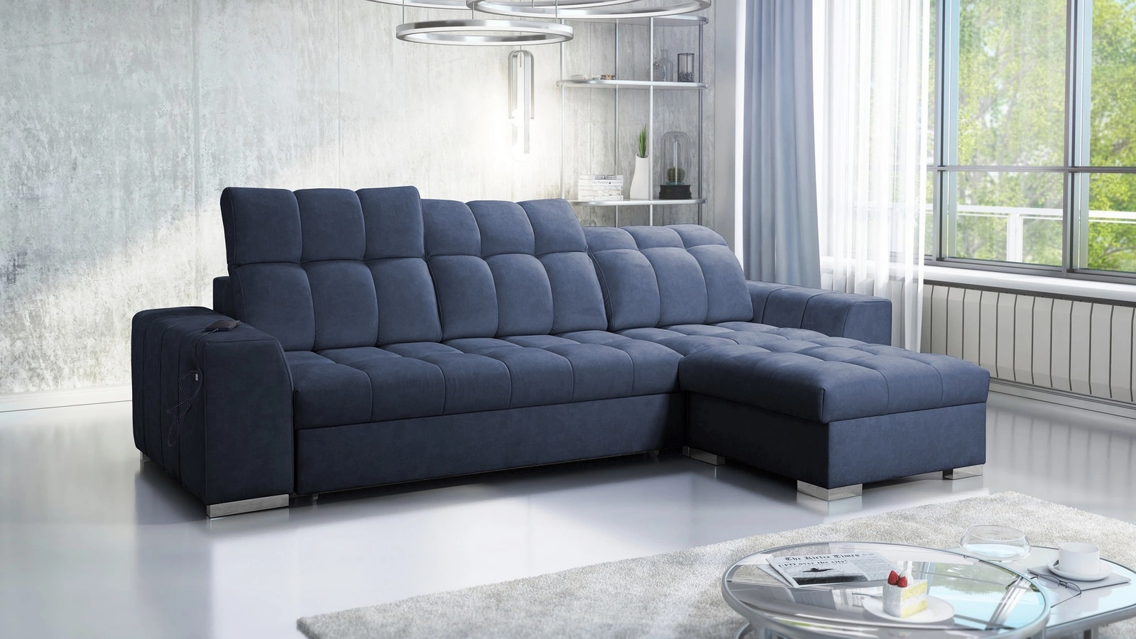 Ecksofa Luigi in blau mit verstellbaren Kopfstützen ist ein reizvolles Möbelstück mit der Garantie für höchsten Komfort und Funktionalität!