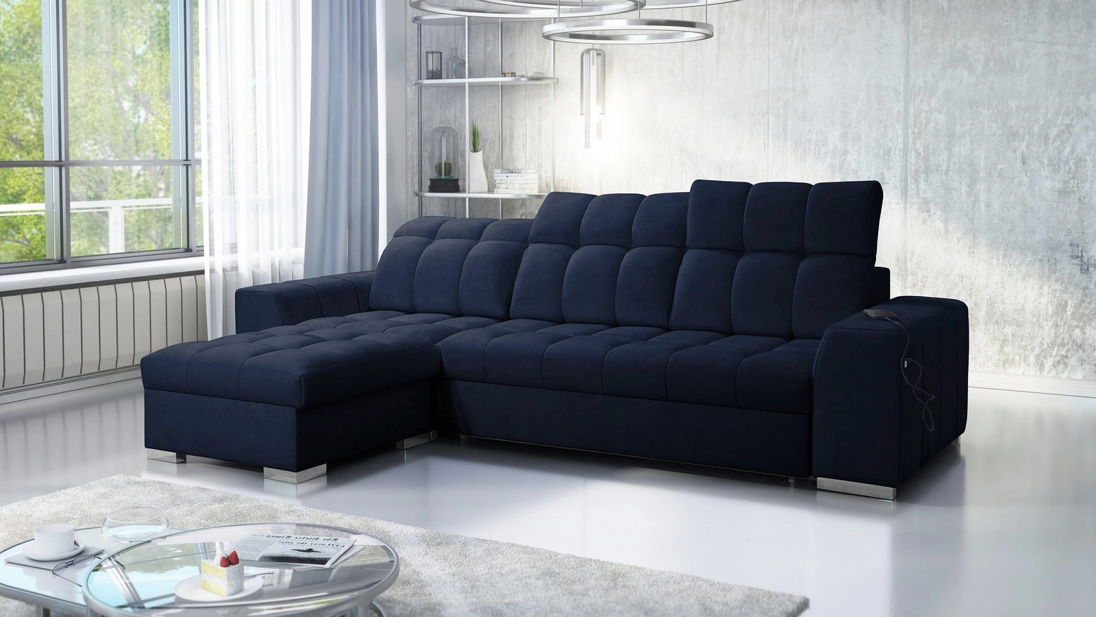 Ecksofa Luigi in marineblau mit verstellbaren Kopfstützen ist ein reizvolles Möbelstück mit der Garantie für höchsten Komfort und Funktionalität!