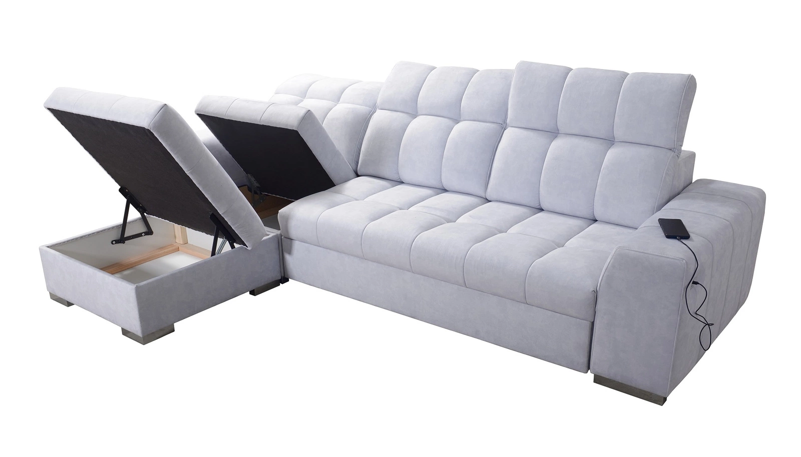 Die Extras dieses Möbels, die alle Nutzer zu schätzen wissen, sind die zwei Bettkästen, die Schlaffunktion und die USB-Ladebuchse an der Seite des Eckmöbels.
