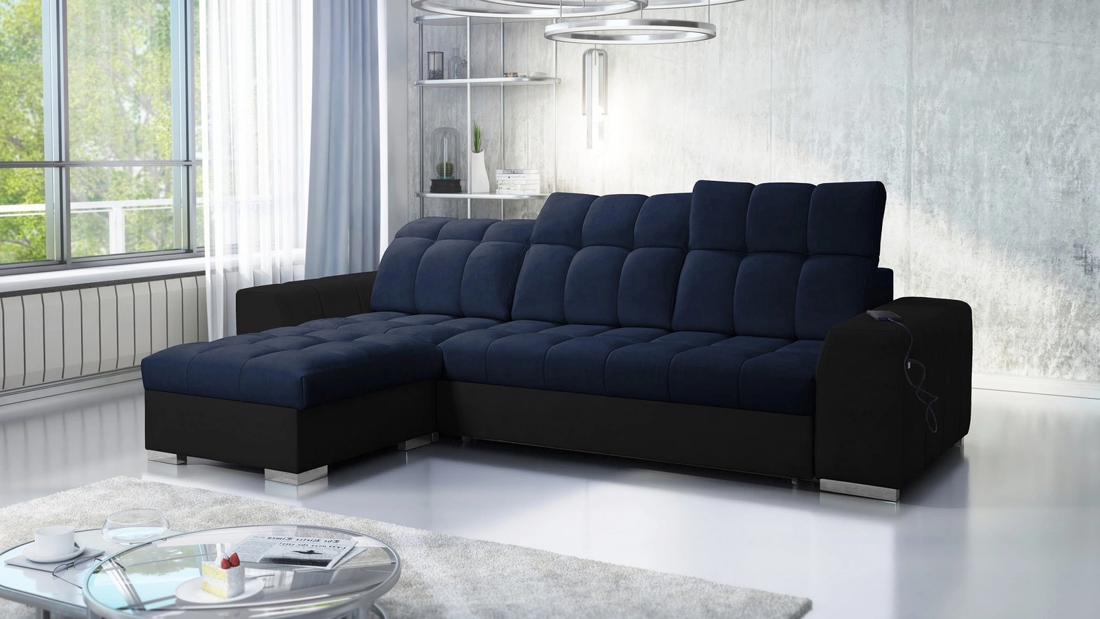 Ecksofa Luigi in marineblau/schwarz mit verstellbaren Kopfstützen ist ein reizvolles Möbelstück mit der Garantie für höchsten Komfort und Funktionalität!