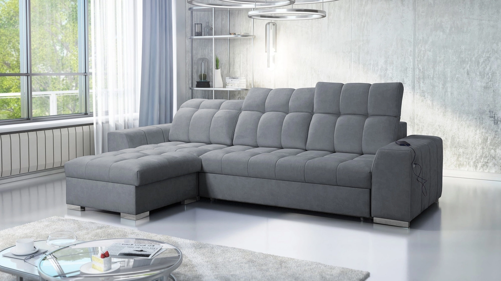 Die Extras dieses Möbels, die alle Nutzer zu schätzen wissen, sind die zwei Bettkästen, die Schlaffunktion und die USB-Ladebuchse an der Seite des Eckmöbels.