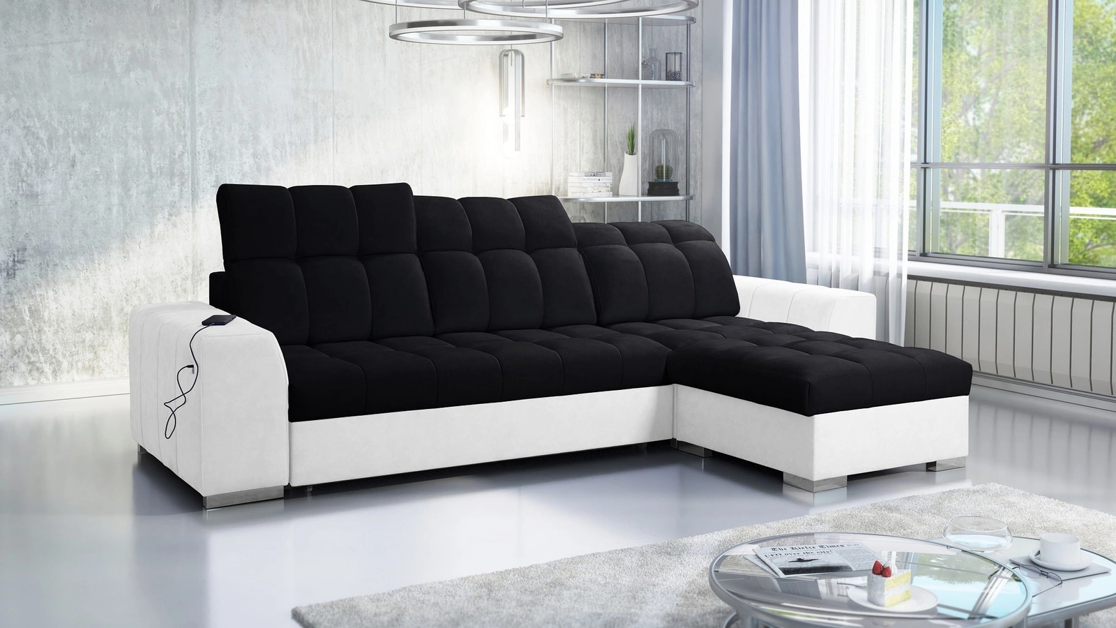 Ecksofa Luigi in Schwarz/Weiß mit verstellbaren Kopfstützen ist ein reizvolles Möbelstück mit Garantie für höchsten Komfort und Funktionalität!