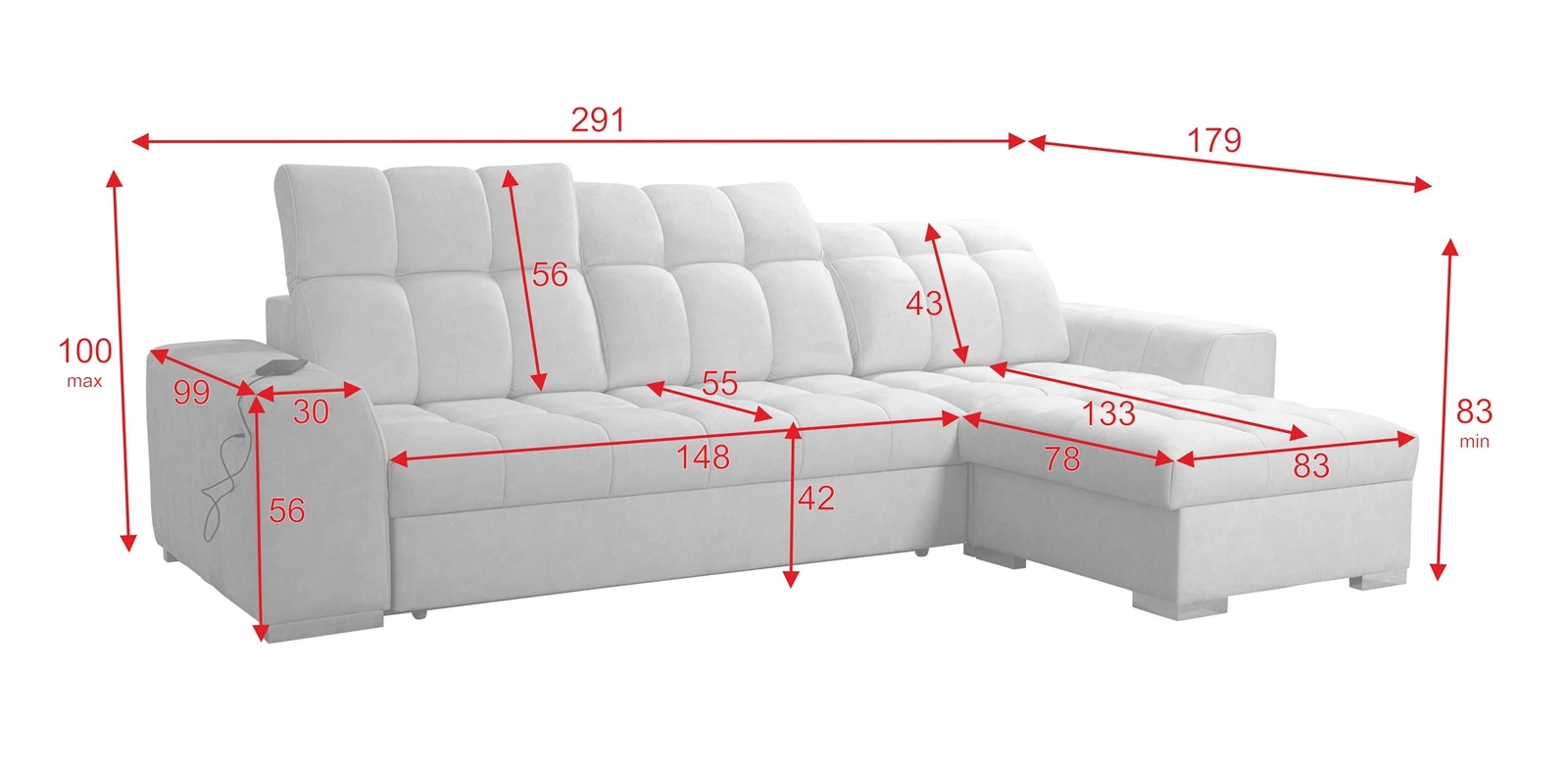 Die Abmessungen der Möbel sind optimal. Breite der Ecke 291 cm, maximale Höhe 100 cm und Tiefe 179 cm. Die Liegefläche der Eckeinheit beträgt 127x226 cm. Die Sitzhöhe des Möbels beträgt 42 cm und die maximale Höhe der Rückenlehne beträgt 56 cm. Gewellte Federn und T30-Polyurethanschaum ist das Material, aus dem der Sitz der Ecke hergestellt ist. Feste Rückenlehne mit verstellbaren Kopfstützen garantiert komfortable Entspannung nach einem langen Tag, die Sie, Ihre Lieben und auch Gäste, die auf diesem einzigartigen Ecksofa sitzen, zu schätzen wissen werden!