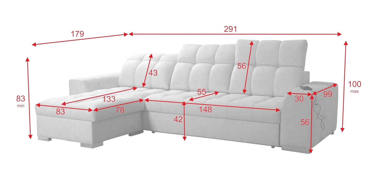 Die Abmessungen der Möbel sind optimal. Breite der Ecke 291 cm, maximale Höhe 100 cm und Tiefe 179 cm. Die Liegefläche der Eckeinheit beträgt 127x226 cm. Die Sitzhöhe des Möbels beträgt 42 cm und die maximale Höhe der Rückenlehne beträgt 56 cm. Gewellte Federn und T30-Polyurethanschaum ist das Material, aus dem der Sitz der Ecke gefertigt ist. Feste Rückenlehne mit verstellbaren Kopfstützen garantiert komfortable Entspannung nach einem langen Tag, die Sie, Ihre Lieben und auch Gäste, die auf diesem einzigartigen Ecksofa Platz nehmen, zu schätzen wissen werden!