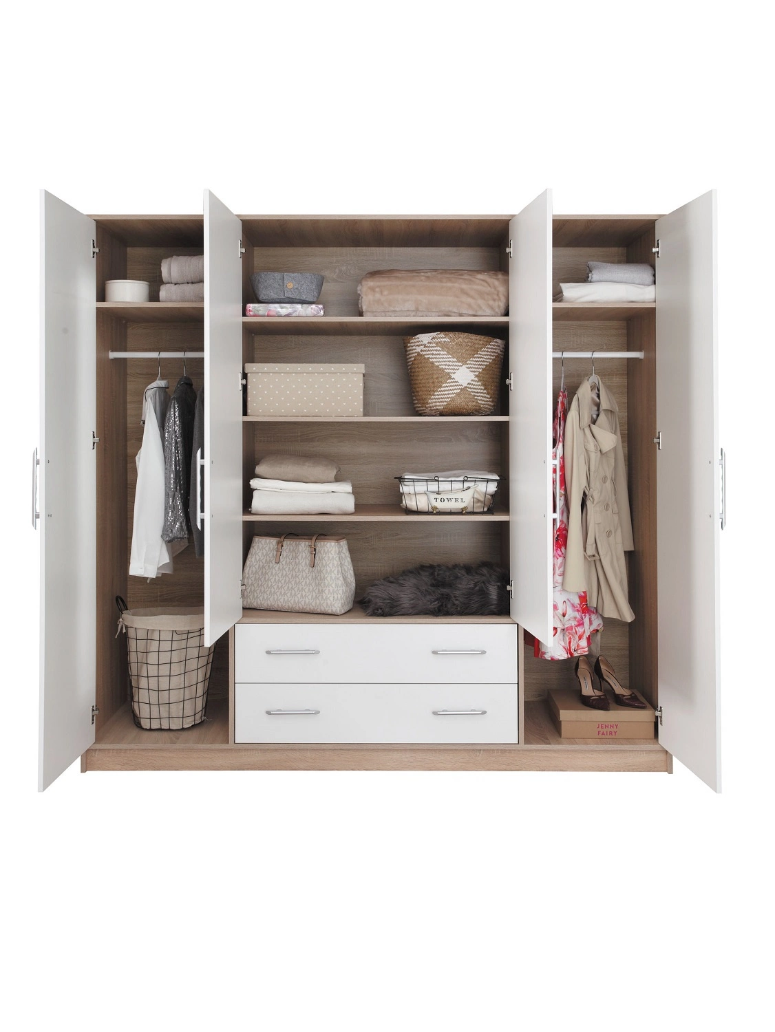 Der Schrank hat flügeltüren mit einer matten Oberfläche matt. Die Möbel bestehen aus 4 Türen und 2 Schubladen. Aluminiumgriffe ergänzen die Schrankfronten. Der Kleiderschrank ist aus hochwertigem laminierter Platte, die gekennzeichnet ist durch hohe widerstand gegen äußere Einflüsse wie Prellungen, Stöße und unglückliche Kratzer.