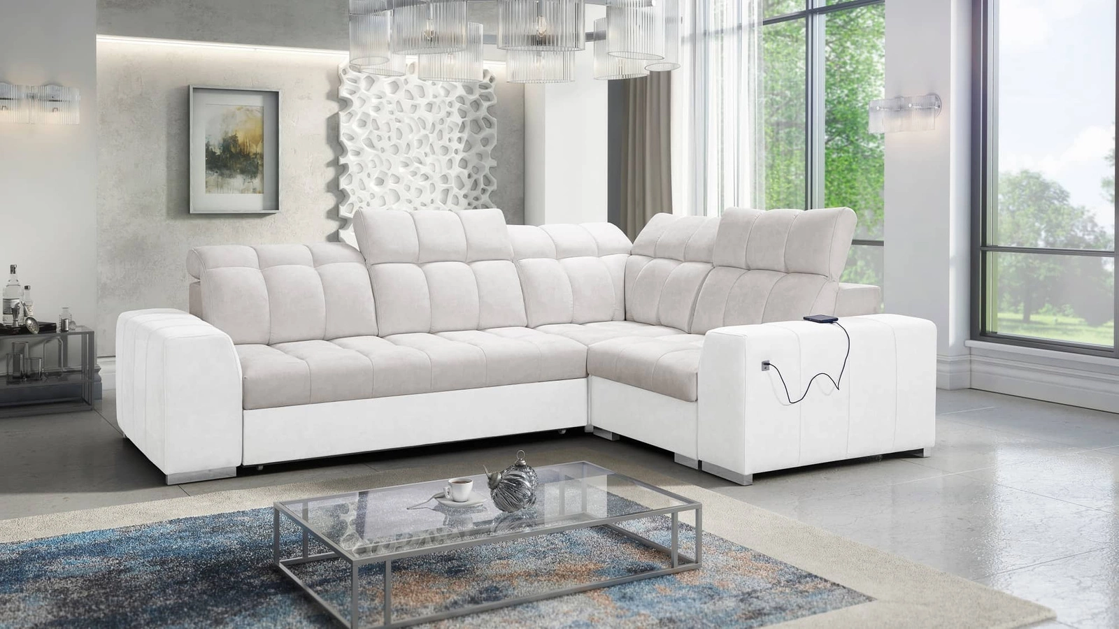 Die Extras dieses Möbels, die alle Nutzer schätzen werden, sind der Bettzeugbehälter, die Schlaffunktion und die USB-Ladebuchse an der Seite des Eckmöbels.