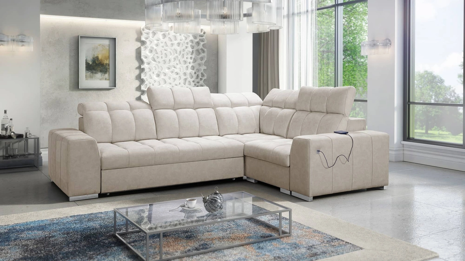 Die Extras dieses Möbels, die alle Nutzer schätzen werden, sind der Bettzeugbehälter, die Schlaffunktion und die USB-Ladebuchse an der Seite des Eckmöbels.