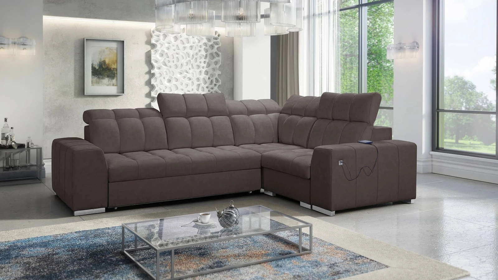 Die Extras dieses Möbels, die alle Nutzer schätzen werden, sind der Bettzeugbehälter, die Schlaffunktion und die USB-Ladebuchse an der Seite des Eckmöbels.